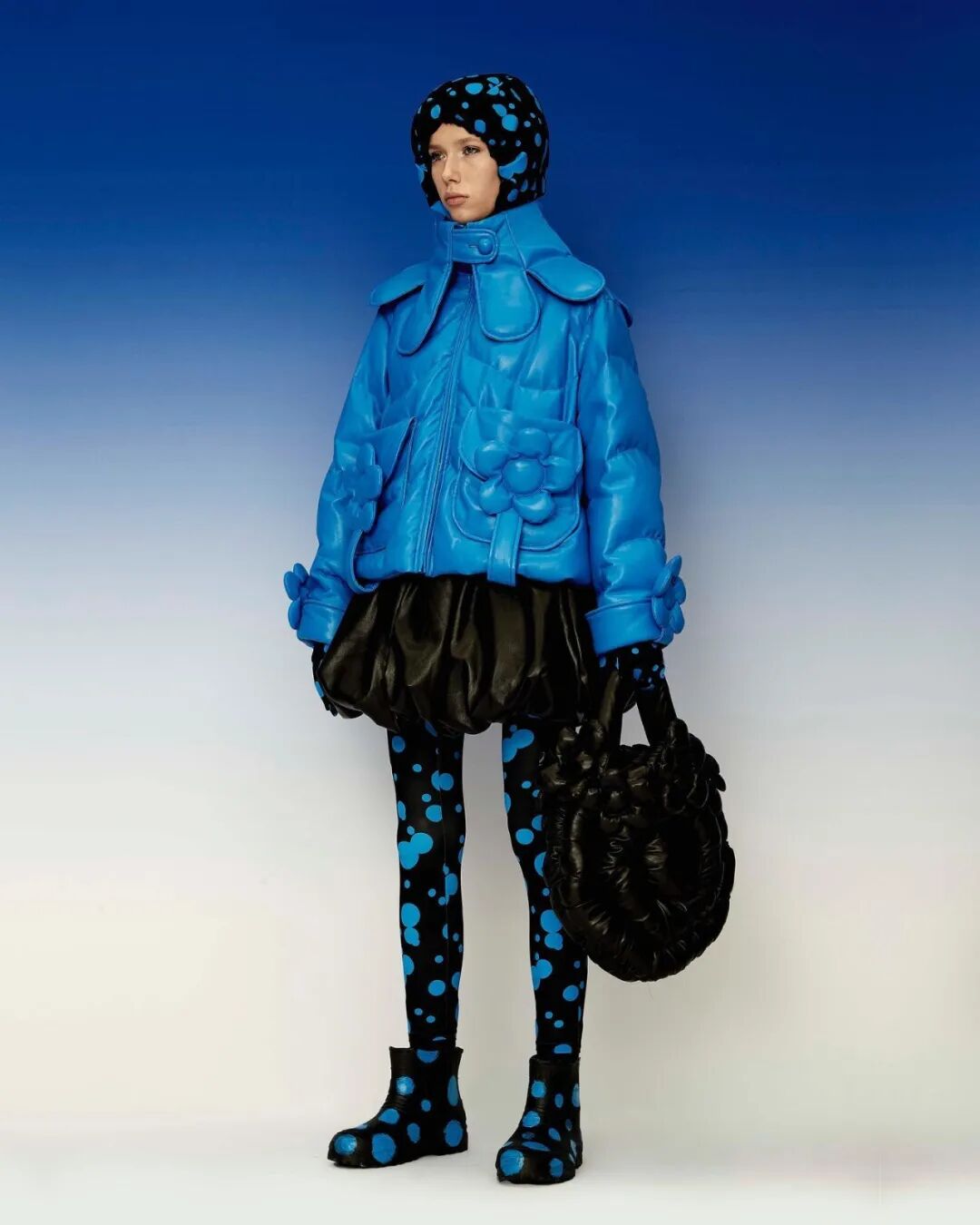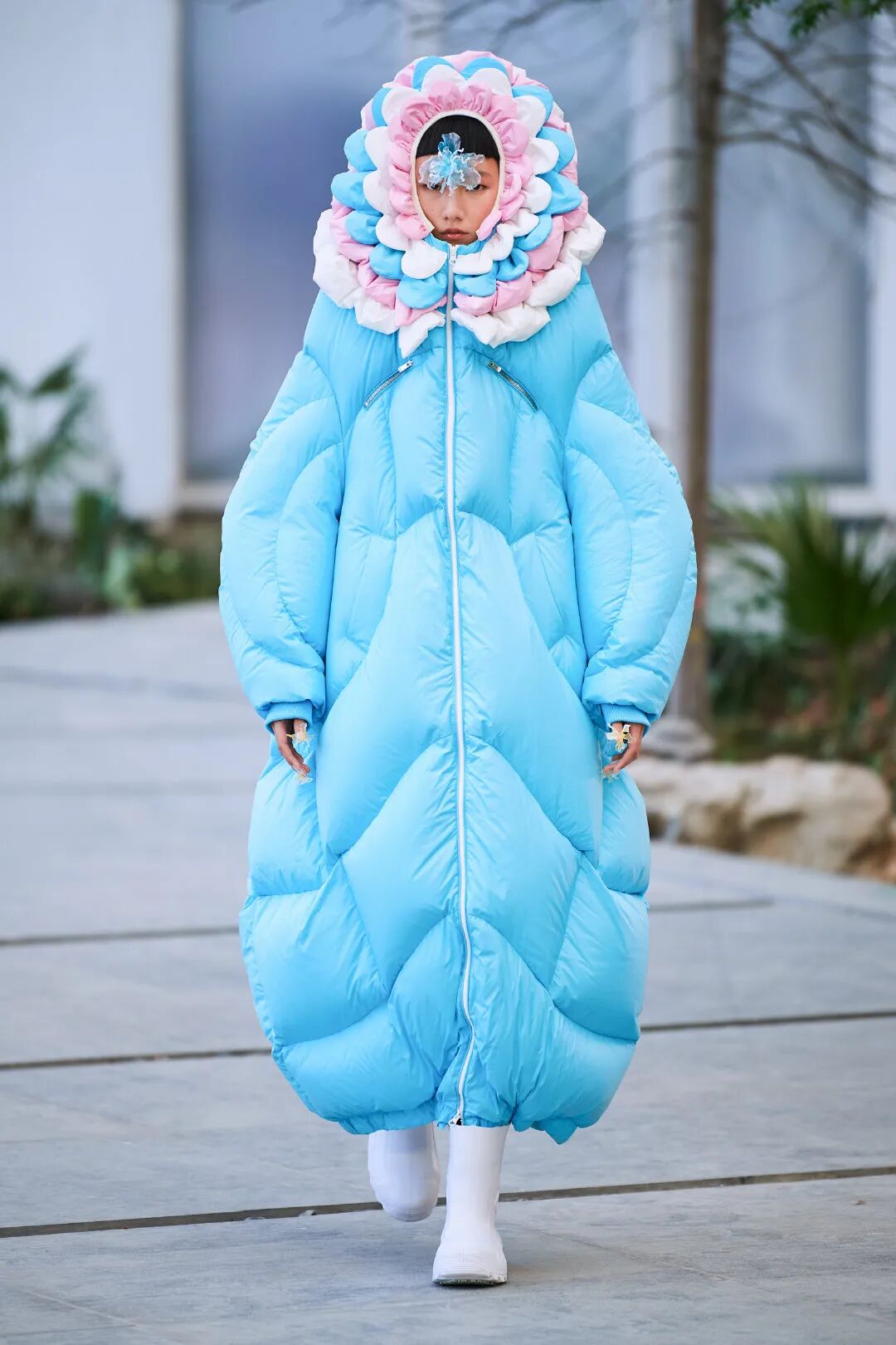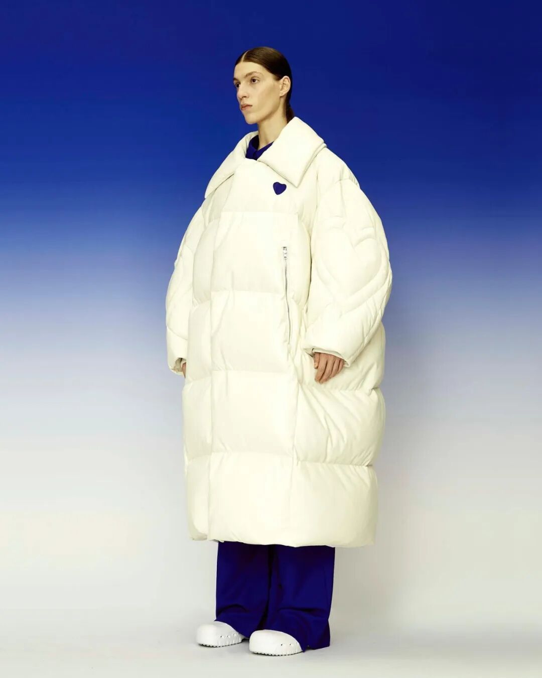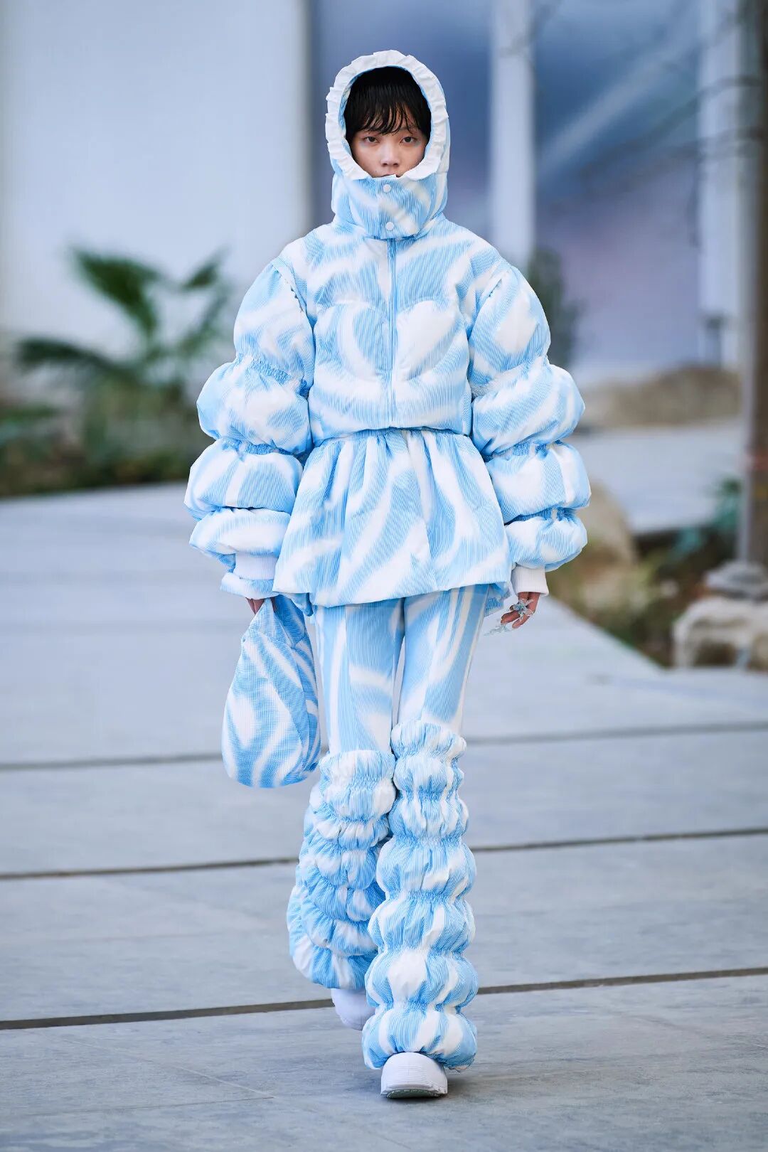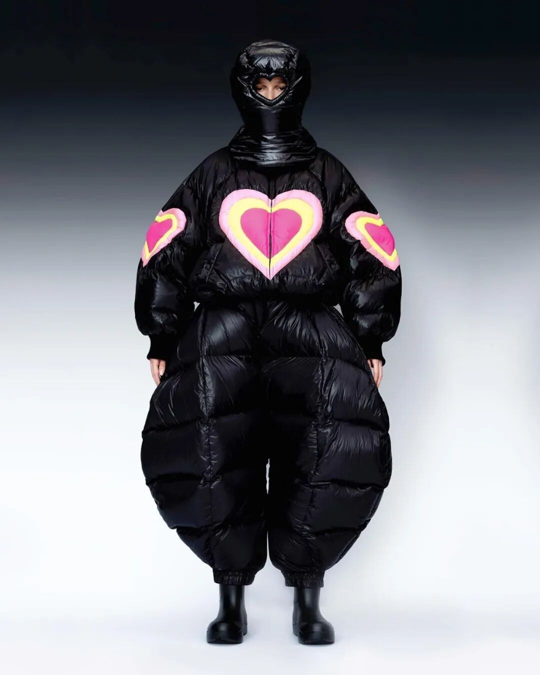 巨大的立体爱心与俏皮的花朵元素通过绗缝、填充手法应用于宽大羽绒服之上,极光和扭曲几何图案搭配比例愈发夸张的廓形,使整个系列充满视觉张力与先锋色彩。