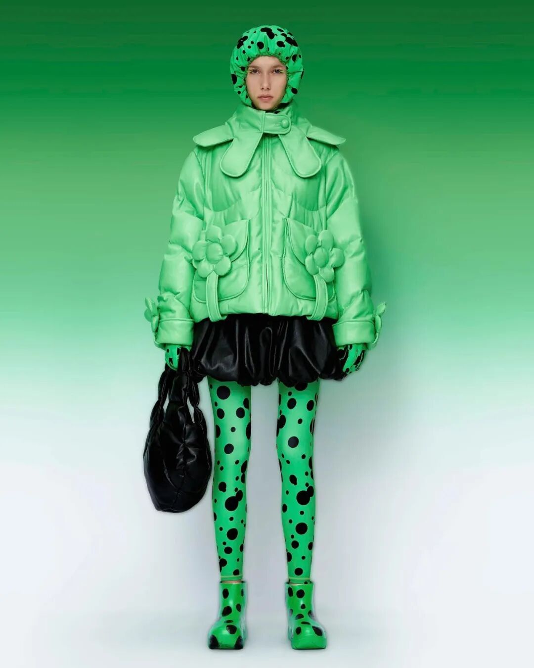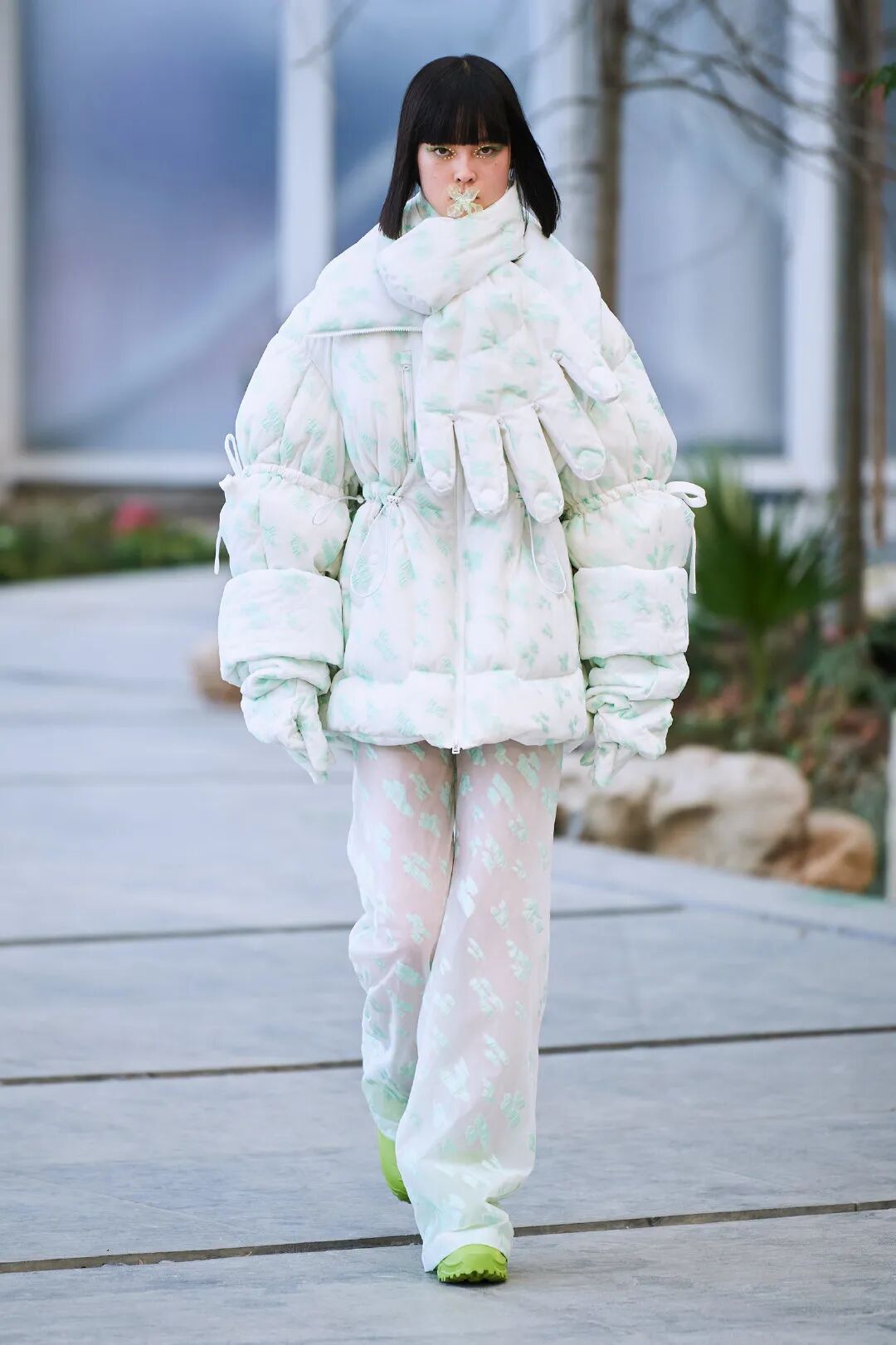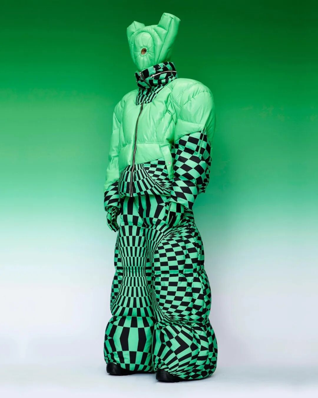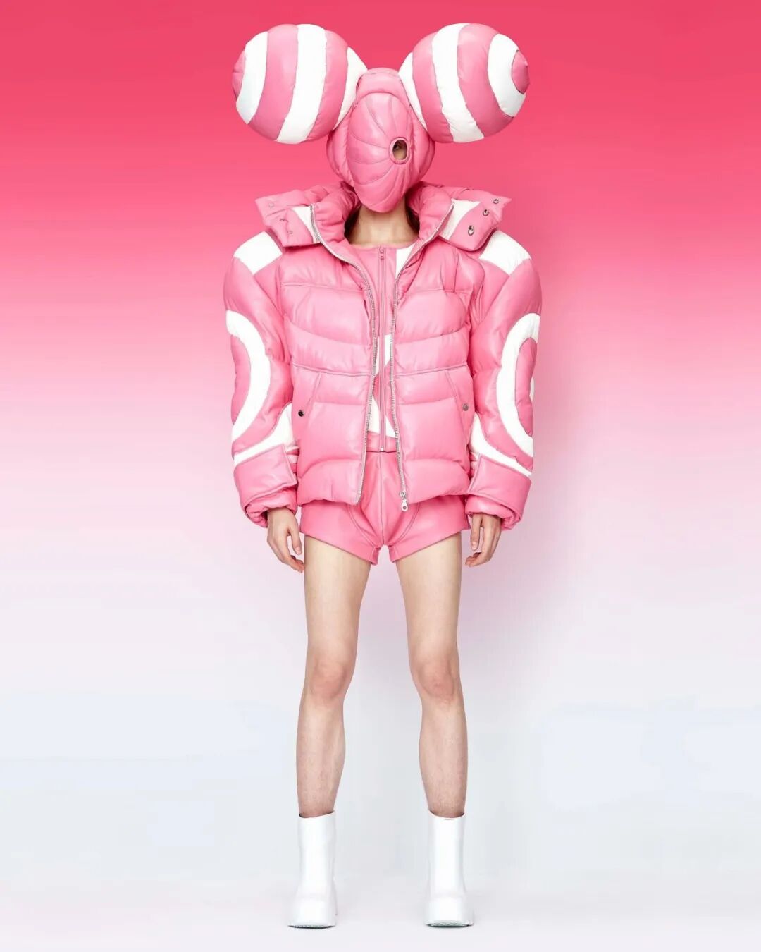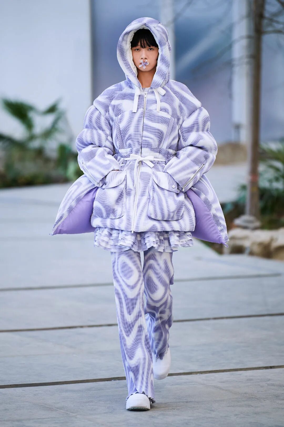 巨大的立体爱心与俏皮的花朵元素通过绗缝、填充手法应用于宽大羽绒服之上,极光和扭曲几何图案搭配比例愈发夸张的廓形,使整个系列充满视觉张力与先锋色彩。