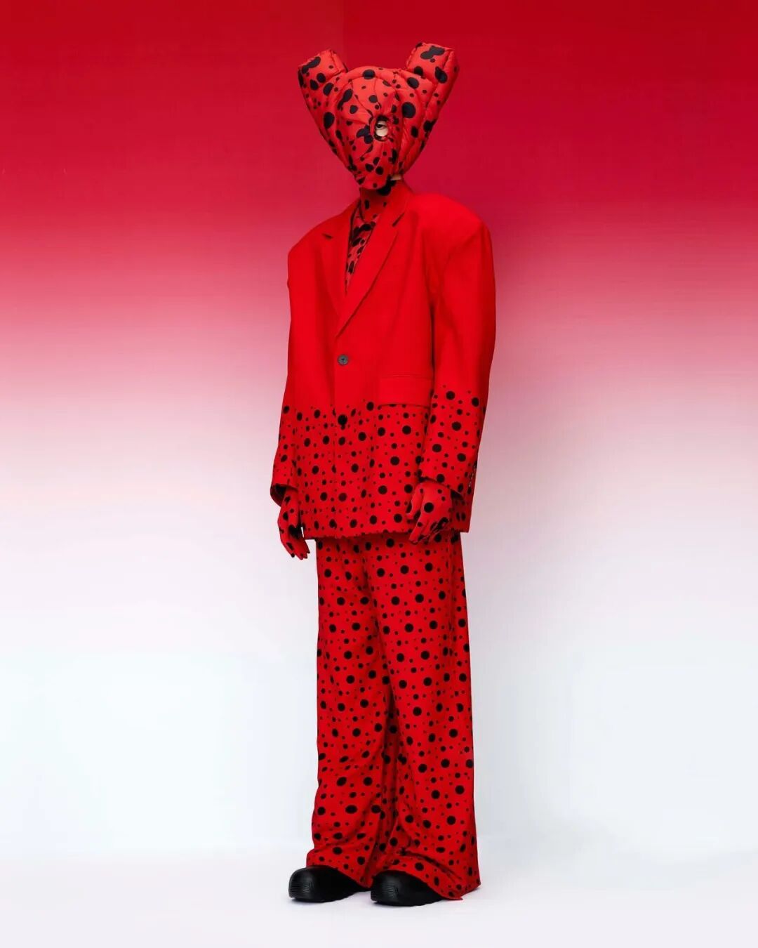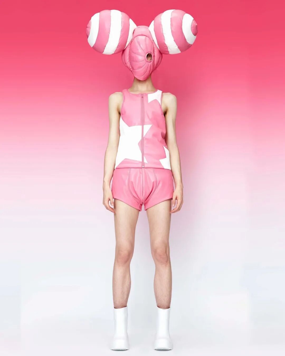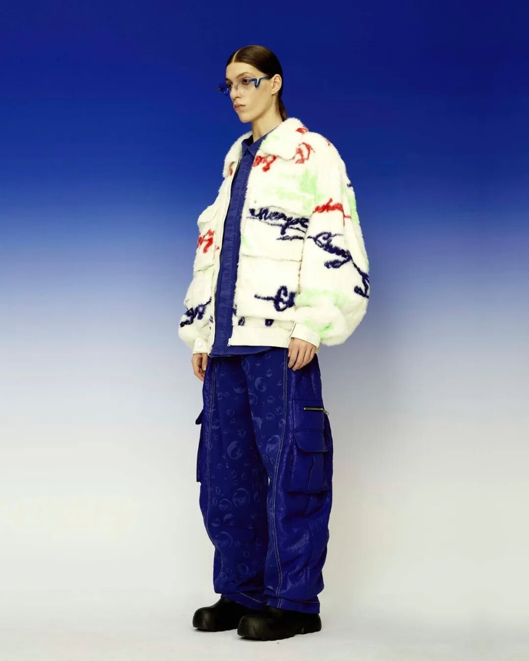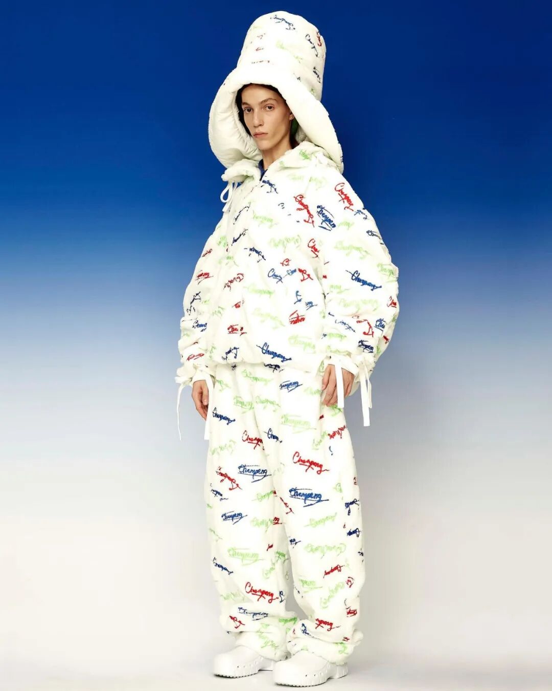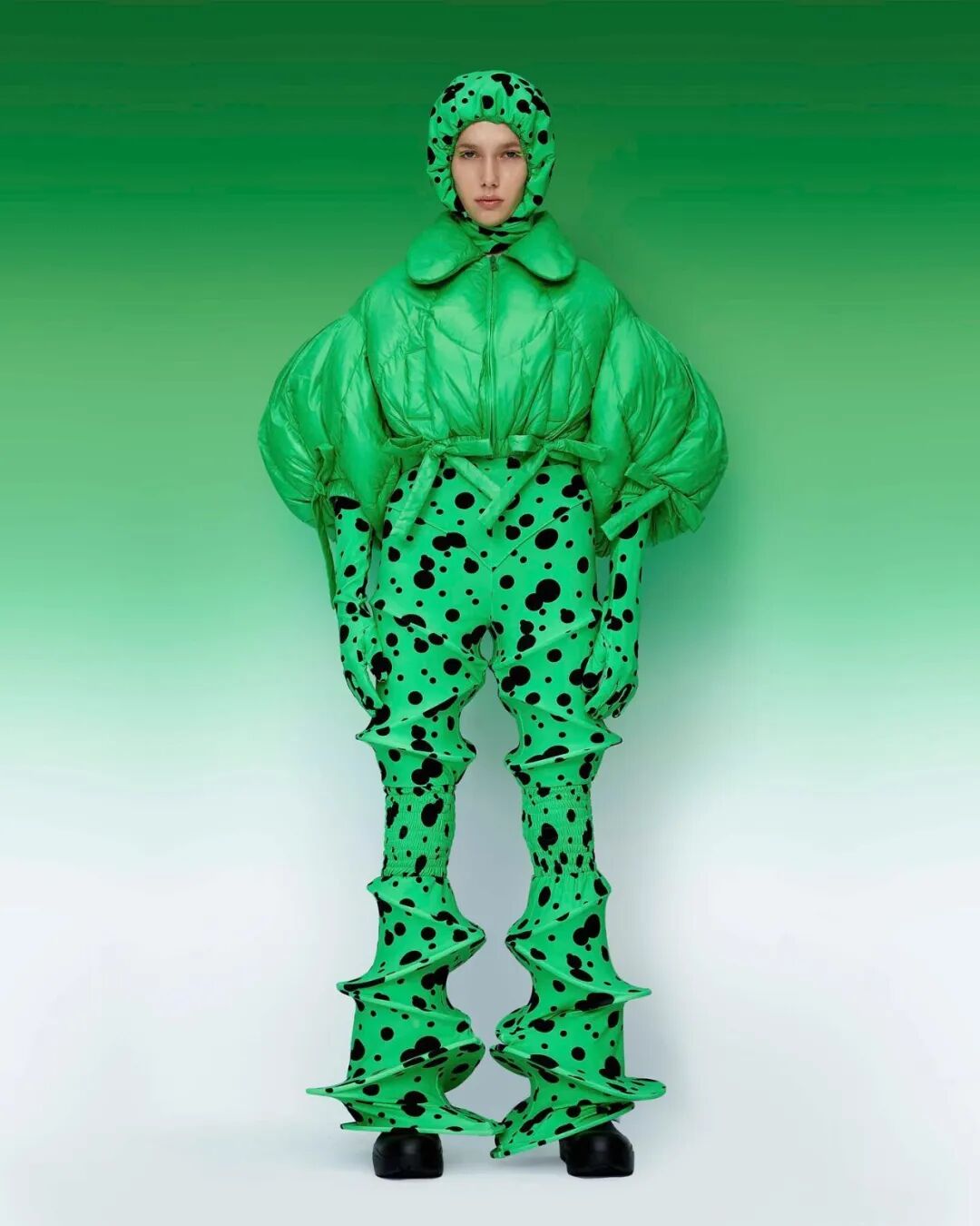 巨大的立体爱心与俏皮的花朵元素通过绗缝、填充手法应用于宽大羽绒服之上,极光和扭曲几何图案搭配比例愈发夸张的廓形,使整个系列充满视觉张力与先锋色彩。