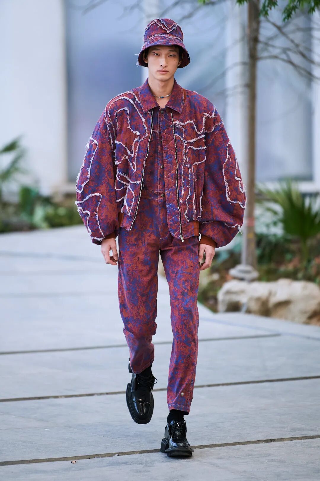 景德镇陶瓷世家的出身与美术基础,无疑也为陈鹏的作品增添了传统艺术的内敛与底蕴。当面对本季夸张的廓形与体积时,欧洲人或许会联想到包豪斯的三人芭蕾,但实际上这些造型的灵感来自于陈鹏家乡景德镇的青花瓷线条之美,地方性的传统美学使之更具优雅。