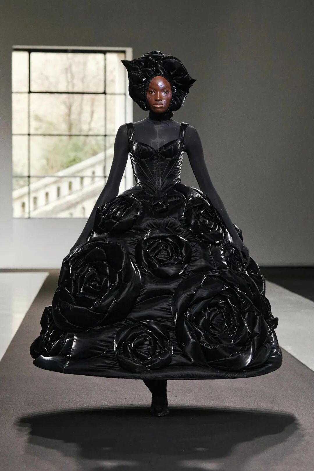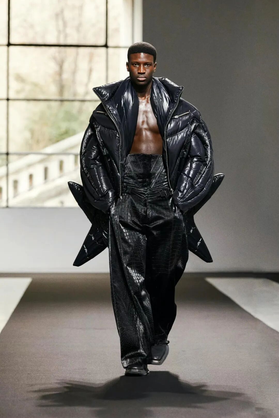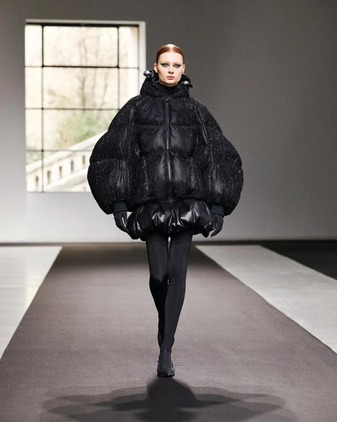 通过羽绒材料填充高级时装的手法,整个系列以黑色为主色调,选用人造水晶、仿生鳄鱼皮革、丝绒提花、回收尼龙等可持续材料,在克制的单色美学与华丽的高定工艺的结合之中,传统美学与现代工艺碰撞出了微妙的浪漫。