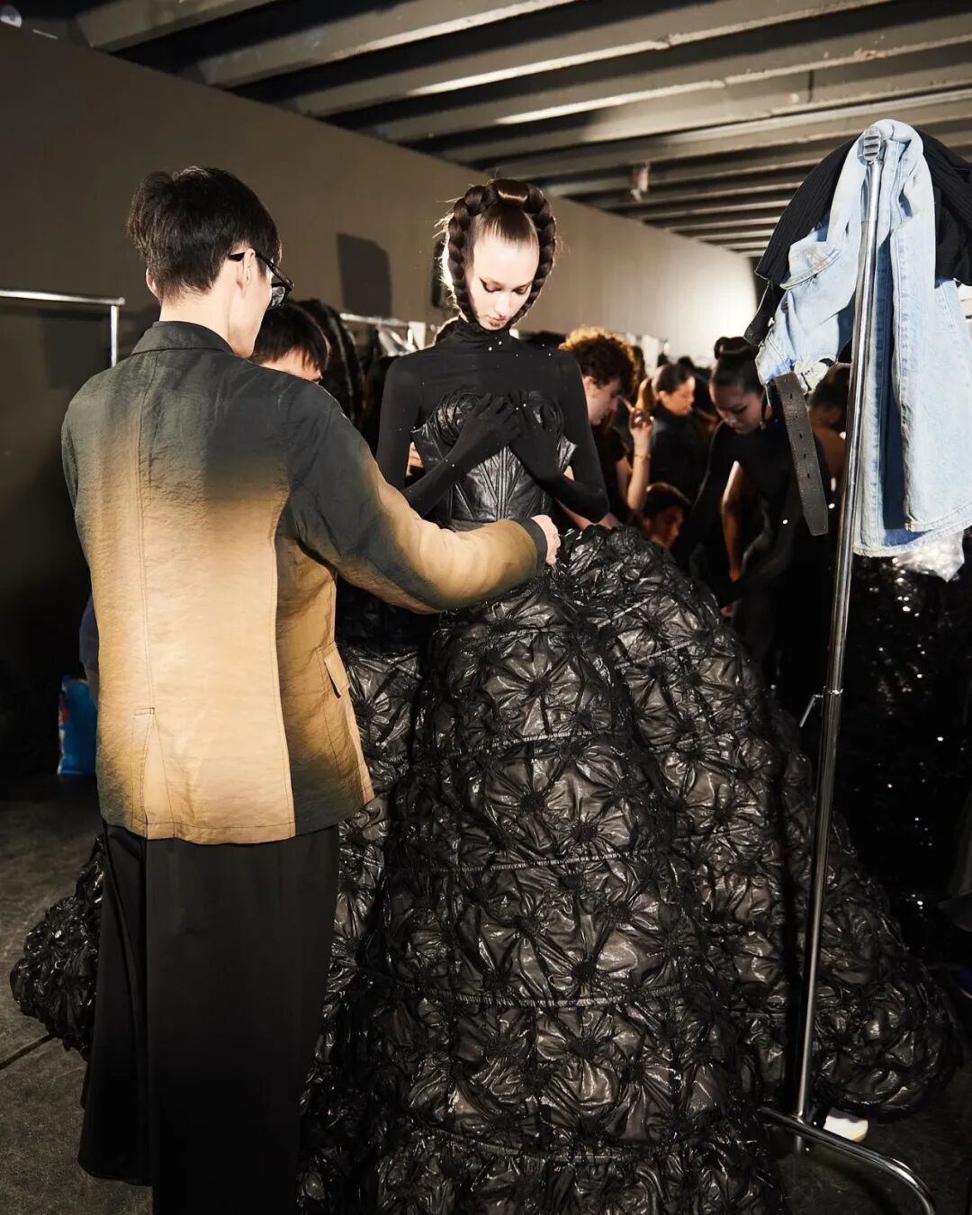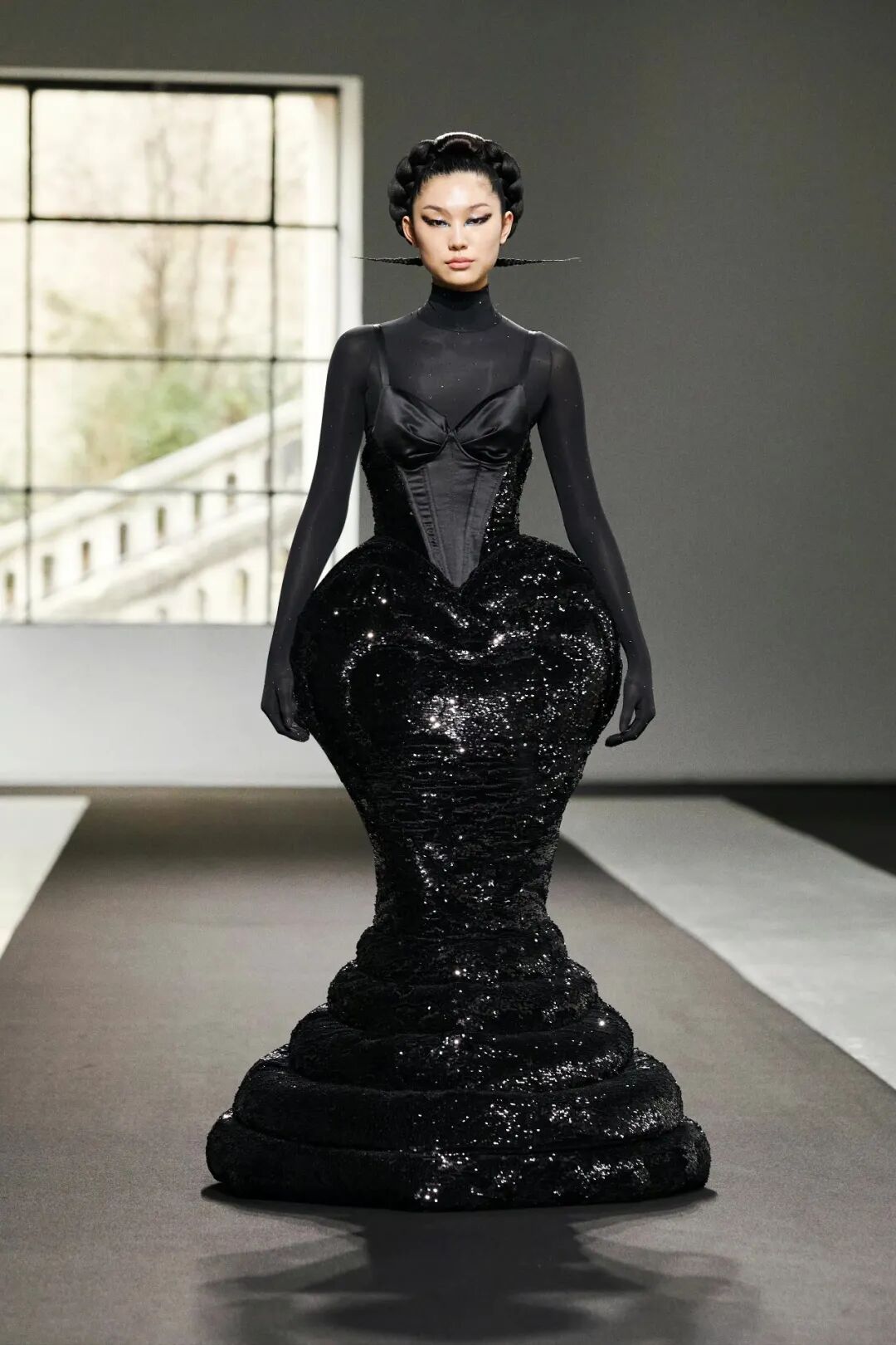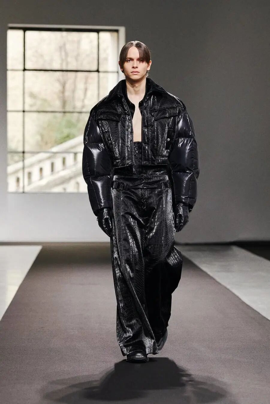 通过羽绒材料填充高级时装的手法,整个系列以黑色为主色调,选用人造水晶、仿生鳄鱼皮革、丝绒提花、回收尼龙等可持续材料,在克制的单色美学与华丽的高定工艺的结合之中,传统美学与现代工艺碰撞出了微妙的浪漫。