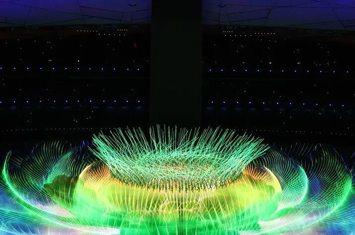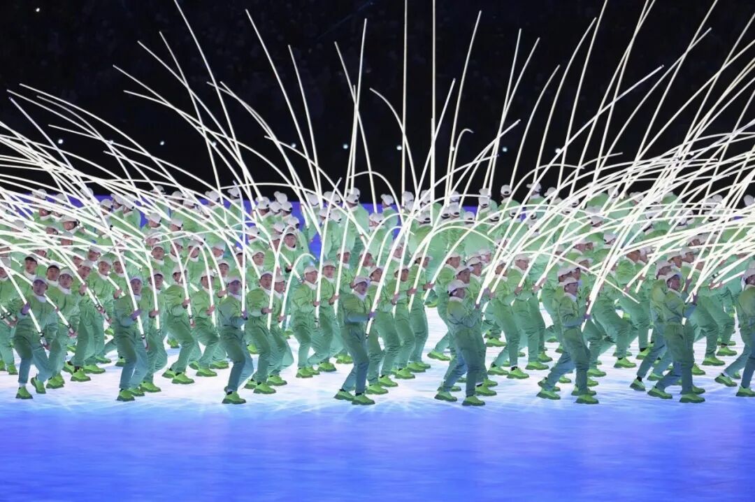 《立春》作为冬奥会开场节目,其灵感来源于开幕日期的立春之日——二十四节气之首。CHENPENG团队以款式简洁的工装连体服为基础,强调肩部廓形,在便于活动的同时呈现力量感。面料则选择了如植被表皮般绿意盎然的光泽软缎面料,在视觉上呈现出春芽破土的春日生命力。