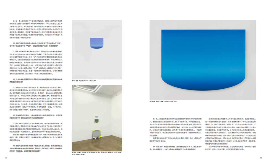 陈文骥 =C: 今天每一位艺术家的表达语言试图摆脱前人的影响是不真实的,但作为艺术语言的建立也让艺术家自身不断思考去如何超越自我、去发现经验之外新的视觉可能。在近二十年的艺术实践中,我在逐渐积累和调整着自己的表达方式,至今形成的以矩形和圆形的视觉思考方式已经为自己打开了一个比较完整的思维通道,其中的形态也得到了不间断地演进突破。我想在这一切艺术实践中无法回避各种文化形态曾经对我的影响,而对于这些影响我并不刻意去改变,也没有企图开辟一条新的视觉渠道,仅仅是在此基础上延续一种思考,在自身的表达领域中不断深耕,去无限制地自我探究罢了。这只不过是个人行为的必然反应,而那种无休止地深究又让自己对生命有了不同以往的理解,也是我本能中的一种惯性,一种不断向往中的内心收获,这样的艺术经历和生命体验对我来说特别珍贵。