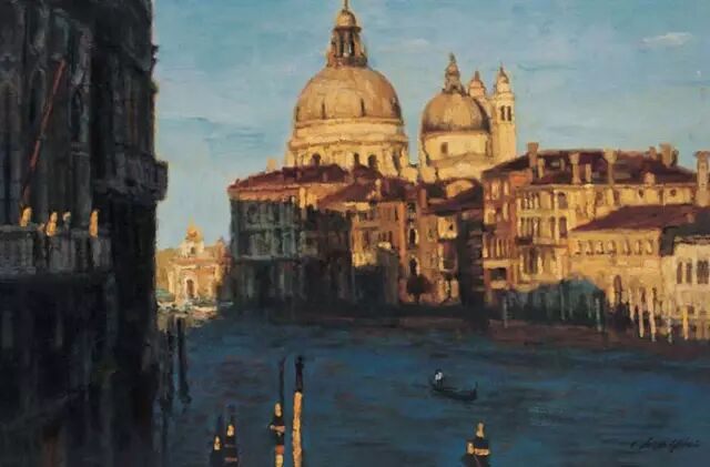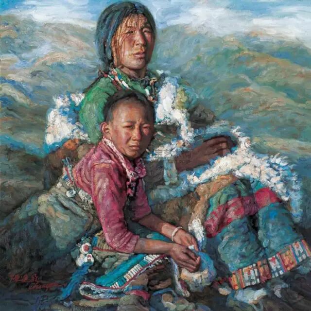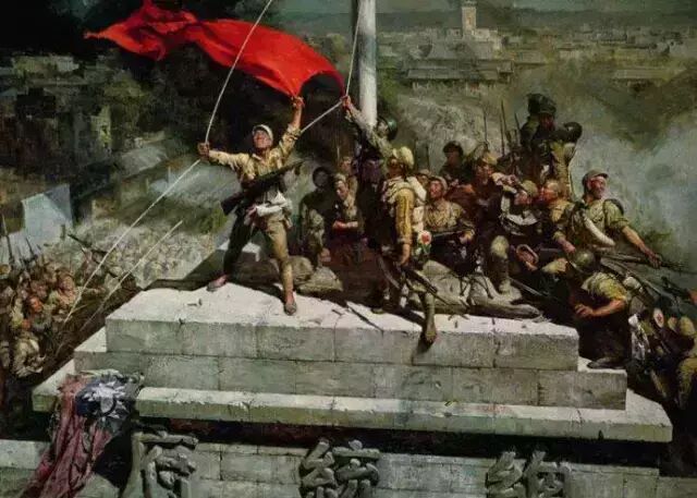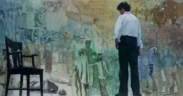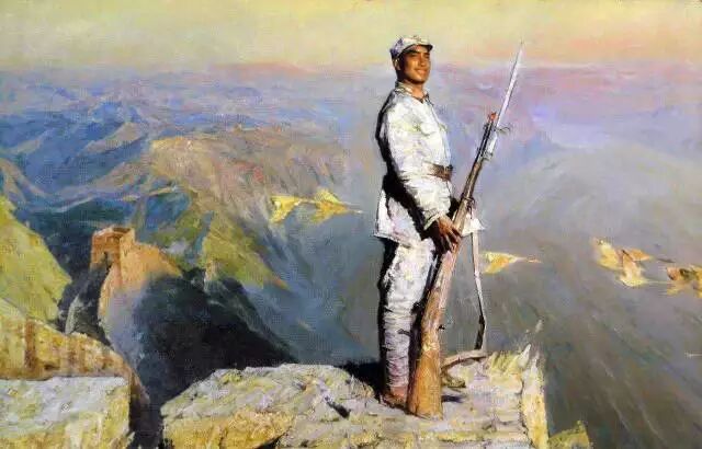 这幅是1972年陈逸飞早年的成名油画,长297厘米、宽143.5厘米,它以宽银幕式绘画,描述一位红军战士站在黄河之巅,眺望天际,此时,霞光初照,高飞的大㕍在战士的脚下飞过,一片浪漫主义豪情......