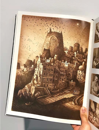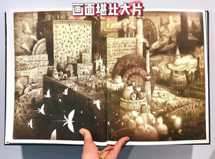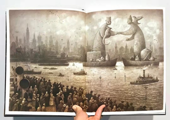 陈志勇在《抵岸》中并没有运用以往擅长的鲜艳色彩,全书都以铅笔素描的单一色调呈现,反而更突出他细腻的笔触以及写实与奇幻兼具的绘画技法。这本以魔幻和童话的手法绘制的无字书,却获得了“澳洲文学奖”。