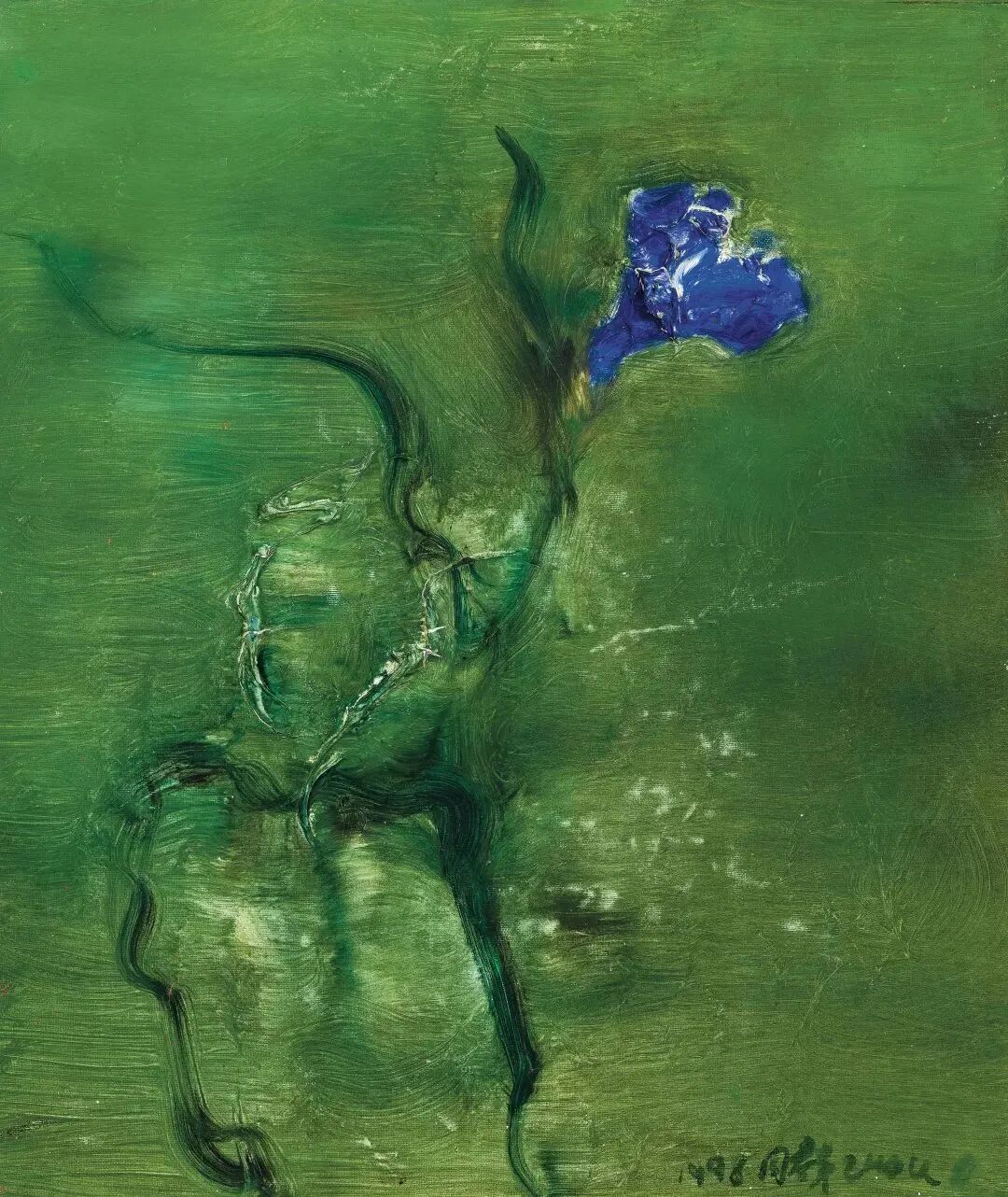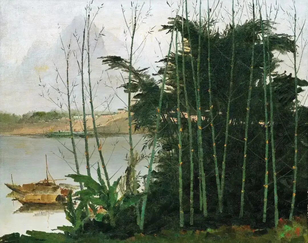 从二十世纪七十至九十年代,吴冠中曾以相似的构图对该主题进行了六次创作,其中四幅都是画于七十年代。此幅《漓江新篁》作于1975年,这一时期是吴冠中油画的鼎盛时期。此幅作品在场上以3800万起拍,4830万成交,成为本场价格最高的作品。