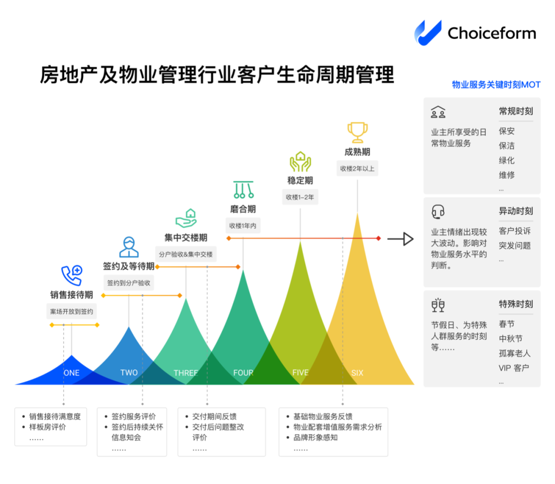 关注房地产及物业管理行业客户旅程中不同触点的数据是突围的一大关键。因此,Choiceform巧思科技提供的解决方案从客户的生命周期出发,覆盖销售接待期、签约及等待期、集中交楼期、到成熟期,抓住客户体验的每一个“关键时刻MOT”。