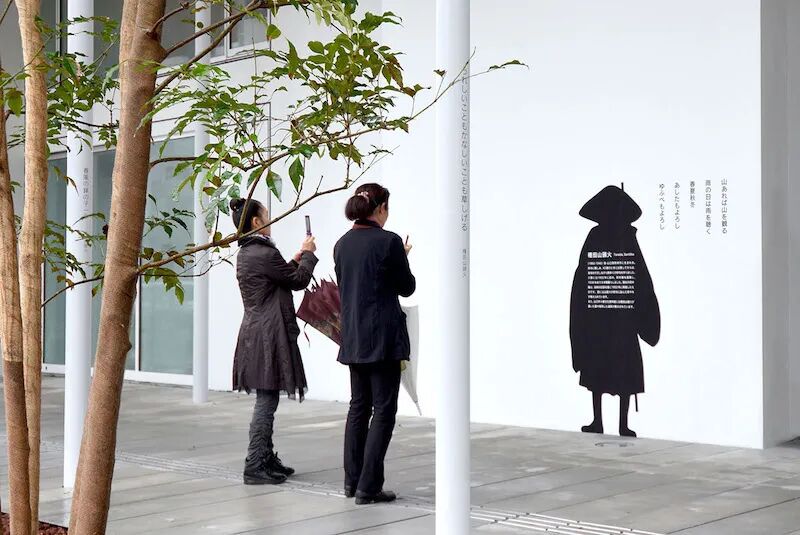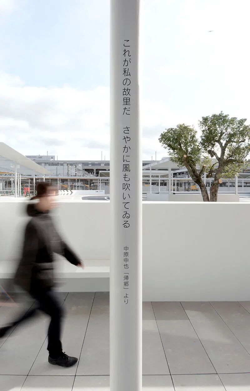 新山口站连接城镇和车站的北口站前广场被命名为“0番线”,设计师宫崎桂设计了简单易读的标识,使用巨大的数字零作为标牌,悬挂式标牌使用立体的对折标签,标识形式新颖,具有较强空间感。设计师同时针对多种交通方式设计了环境图形,应用在对应的交通等候区,使环境更加丰富。特别的是,为了传播该地区的文化,将种田山头火、中原中也等诗人的作品作为空间文化符号,营造了浓厚的人文气息。