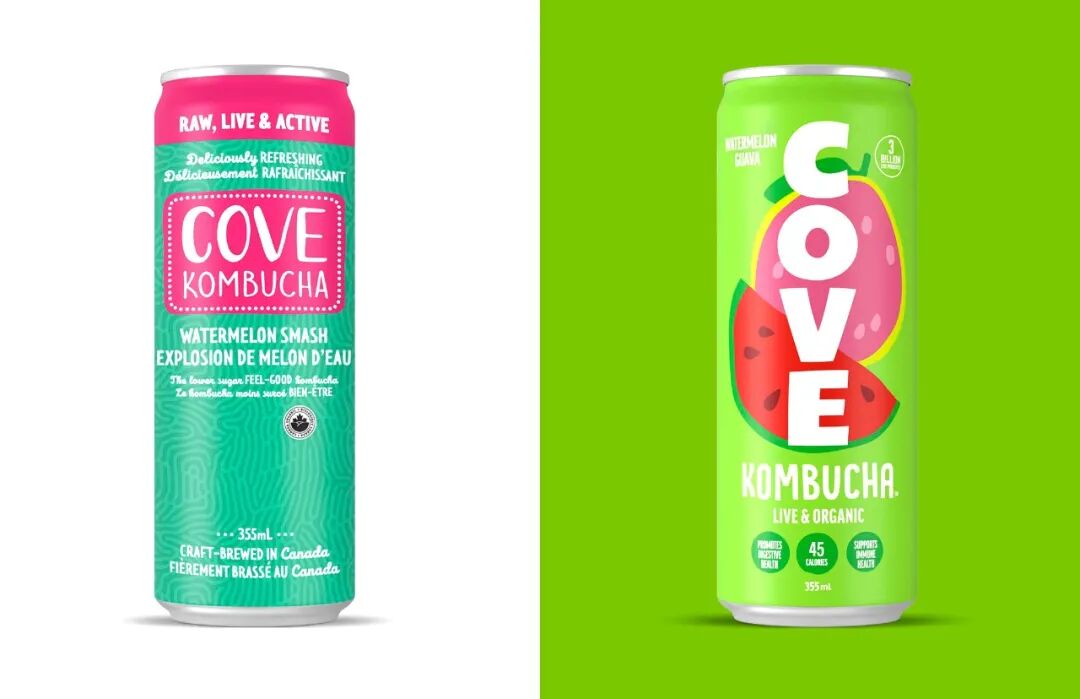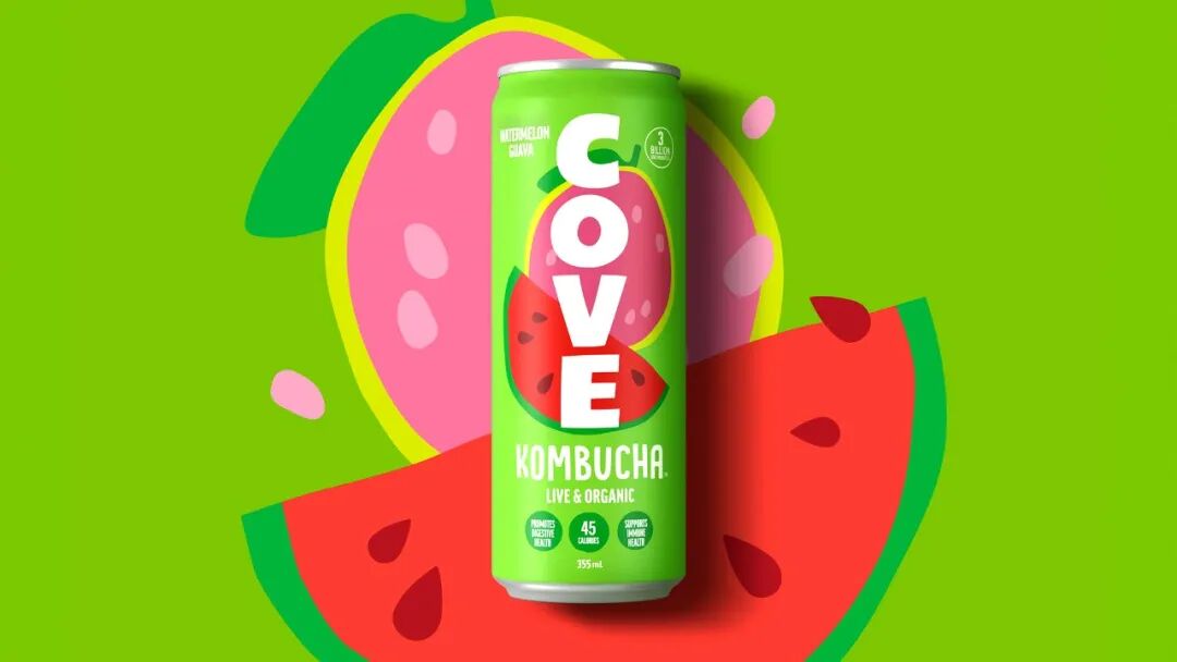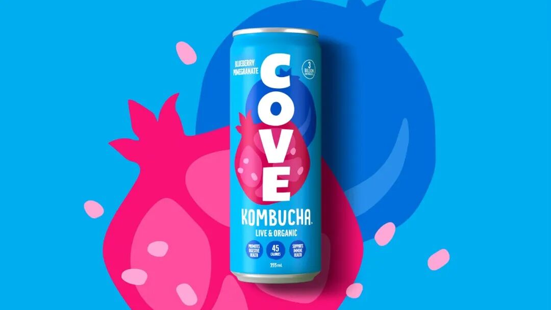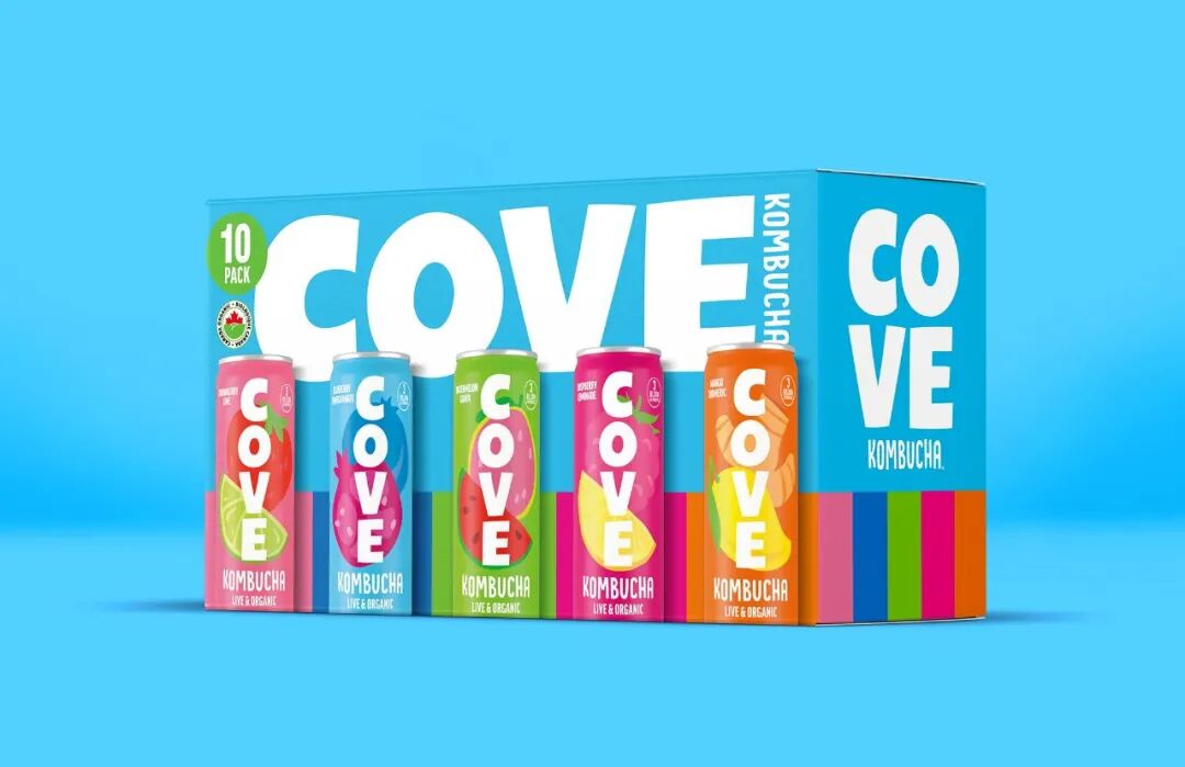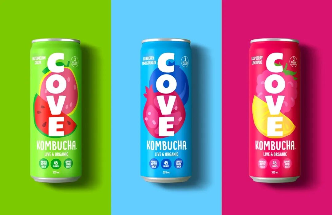 Cove 康普茶包装设计,该产品为促进肠道健康的发酵饮品。新的包装系统由明亮的色调和醒目的字体组成,能够迅速区分该品牌。大胆的将品牌标志竖排普版近整个罐身正面,新的标志致敬原来的古怪,手工雕刻的风格标志。在充满活力和清爽的调色板上,通过有趣的水果插画来传达不同口味的故事。为了帮助教育消费者,罐头底部有一个交流走廊,可以快速方便地宣传康普茶对肠道健康的所有好处。