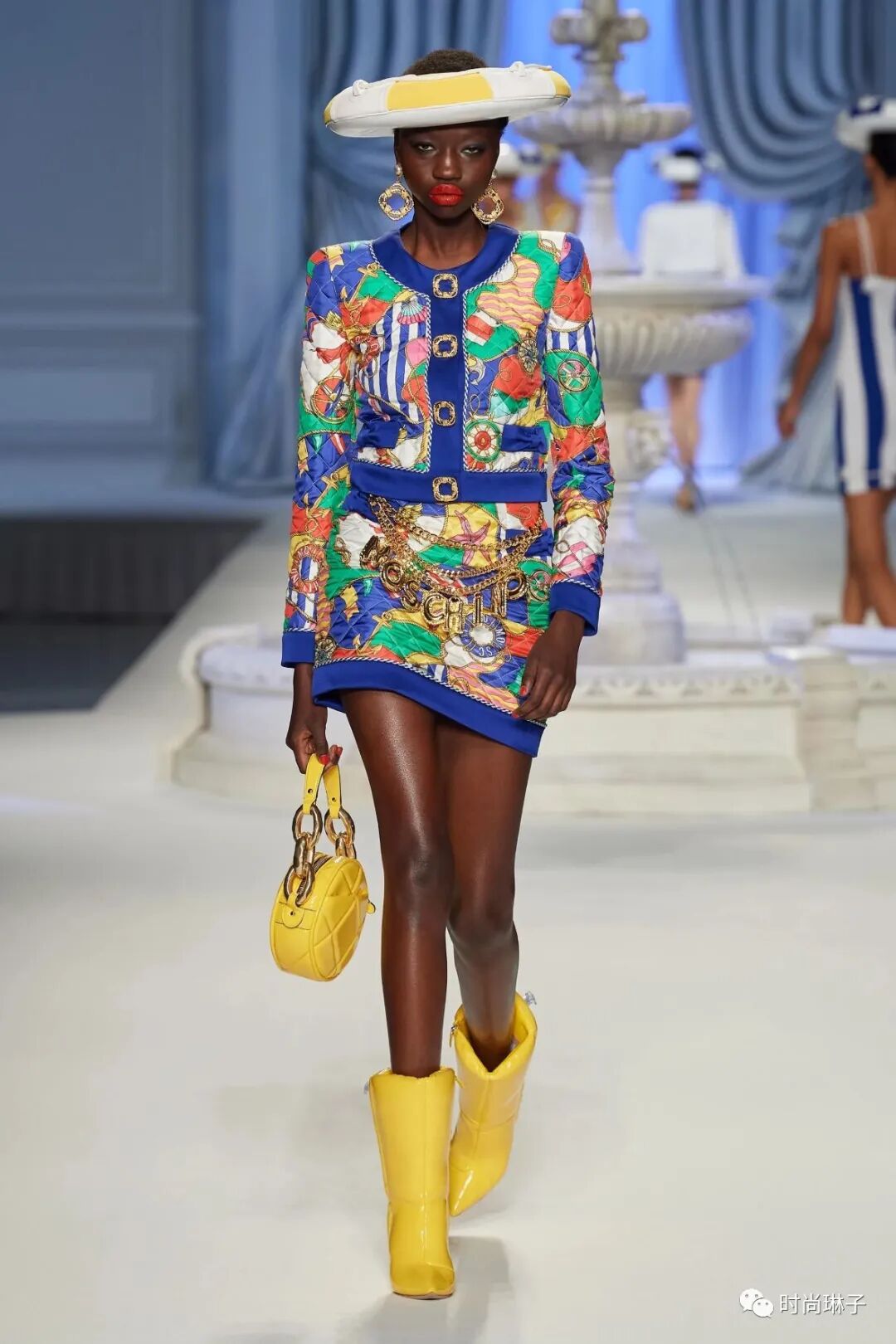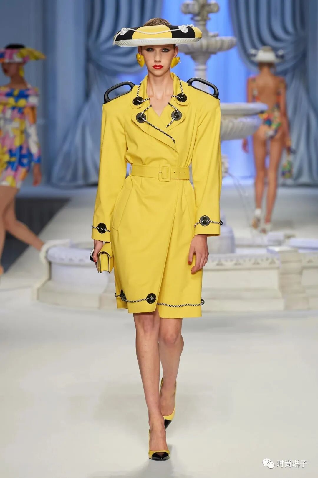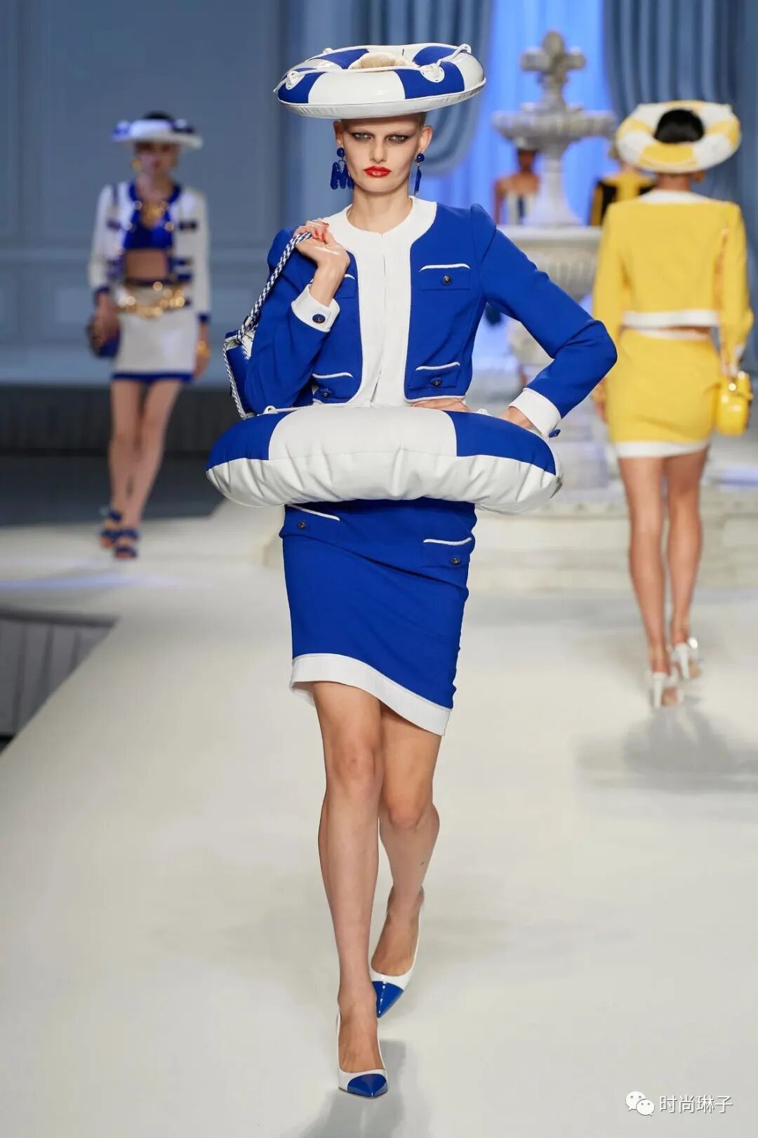 充气膨胀的游泳圈和救生筏离不开阳光海岸。温暖的黄色和海军蓝白色的优雅套装,连衣裙以及泳装上装饰着充气孔和救生筏绳索等元素,搭配游泳圈式的帽子,可作为“以备不时之需”的救生衣,趣味性十足的同时也是一种警醒。