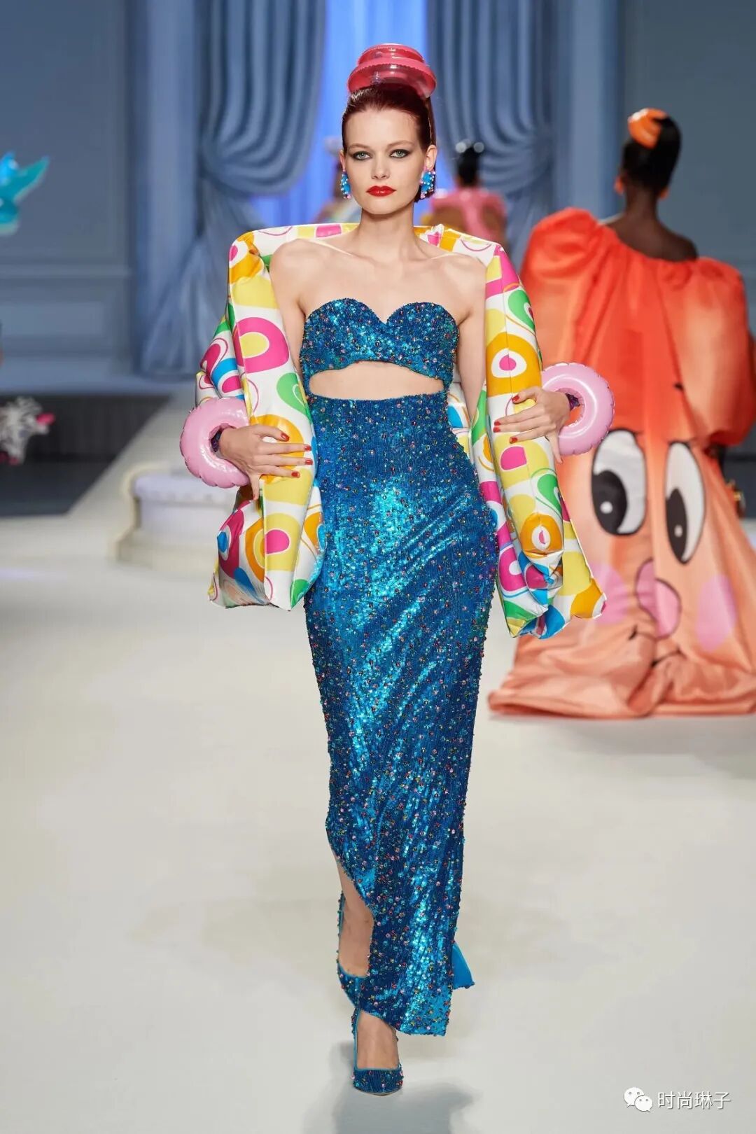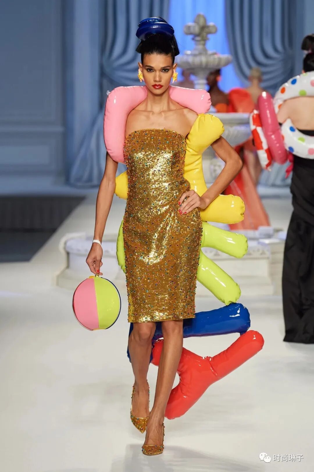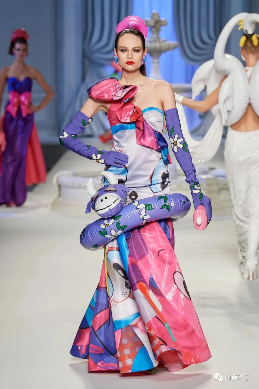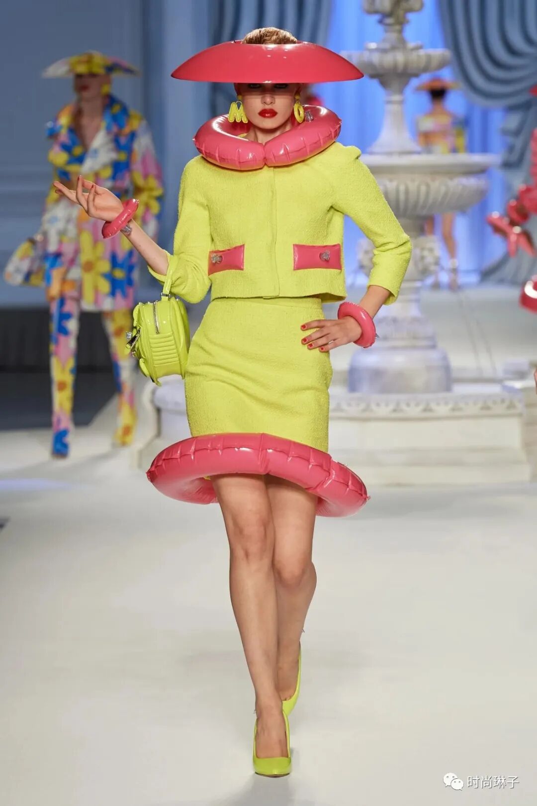 充气印花裙,装饰着粉色游泳圈下摆,袖口和门襟的套装,蓝色海豚裙,白天鹅礼服裙,彩色童趣动物印花套装和连衣裙……搭配充气的外套,可爱配件以及各种造型的游泳圈,打破桎梏,将阳光乐观俏皮的欢乐气息融入该季服饰中,以多彩有趣的方式向超现实主义致敬。