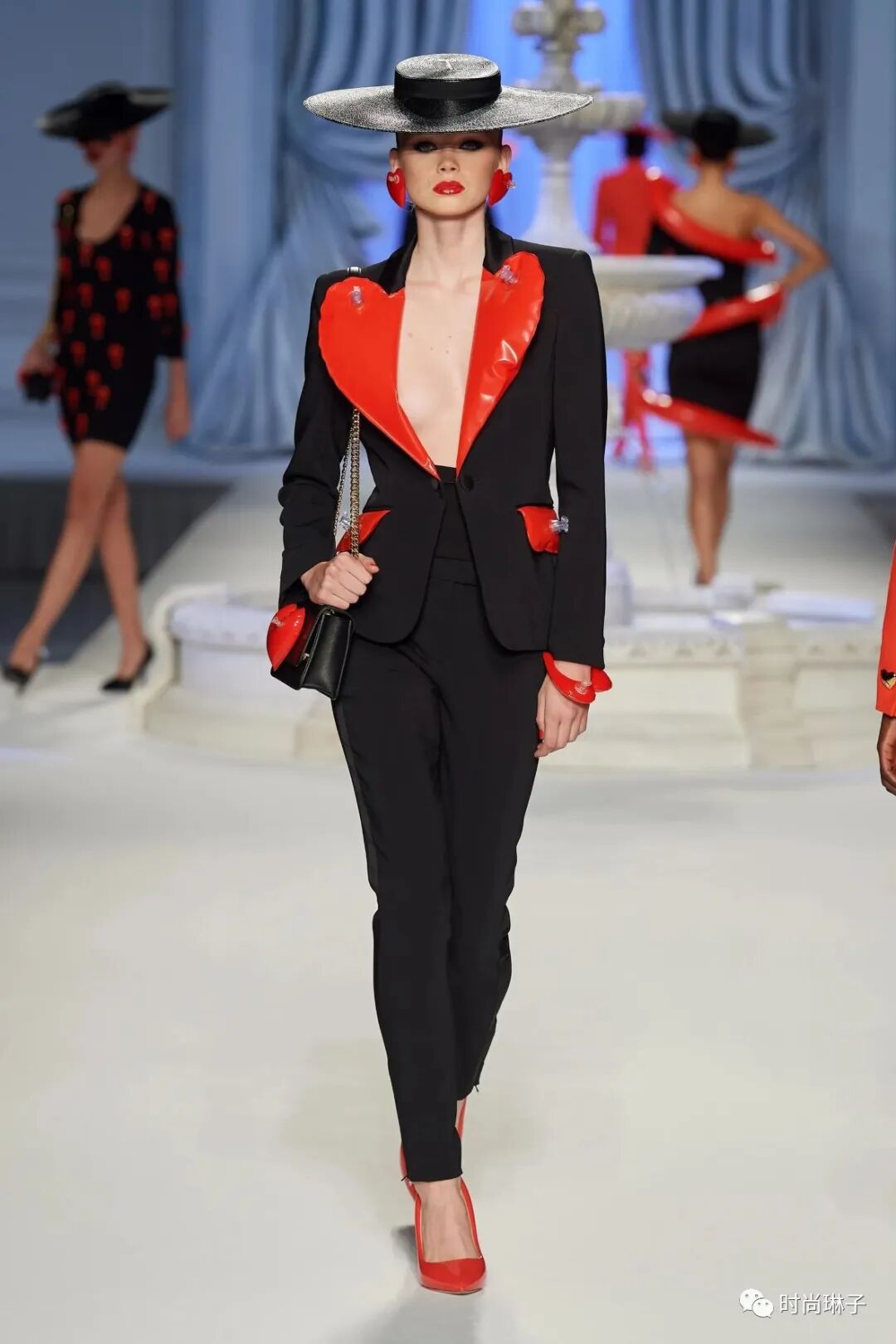 该季鬼才设计师Jeremy Scott 将Moschino品牌标志性的红色爱心充气膨胀,置于胸口,领口,下摆 ….,或作为配饰耳环,手镯,包包搭配精致的黑色套装或连衣裙,使严肃的正装充满童趣。