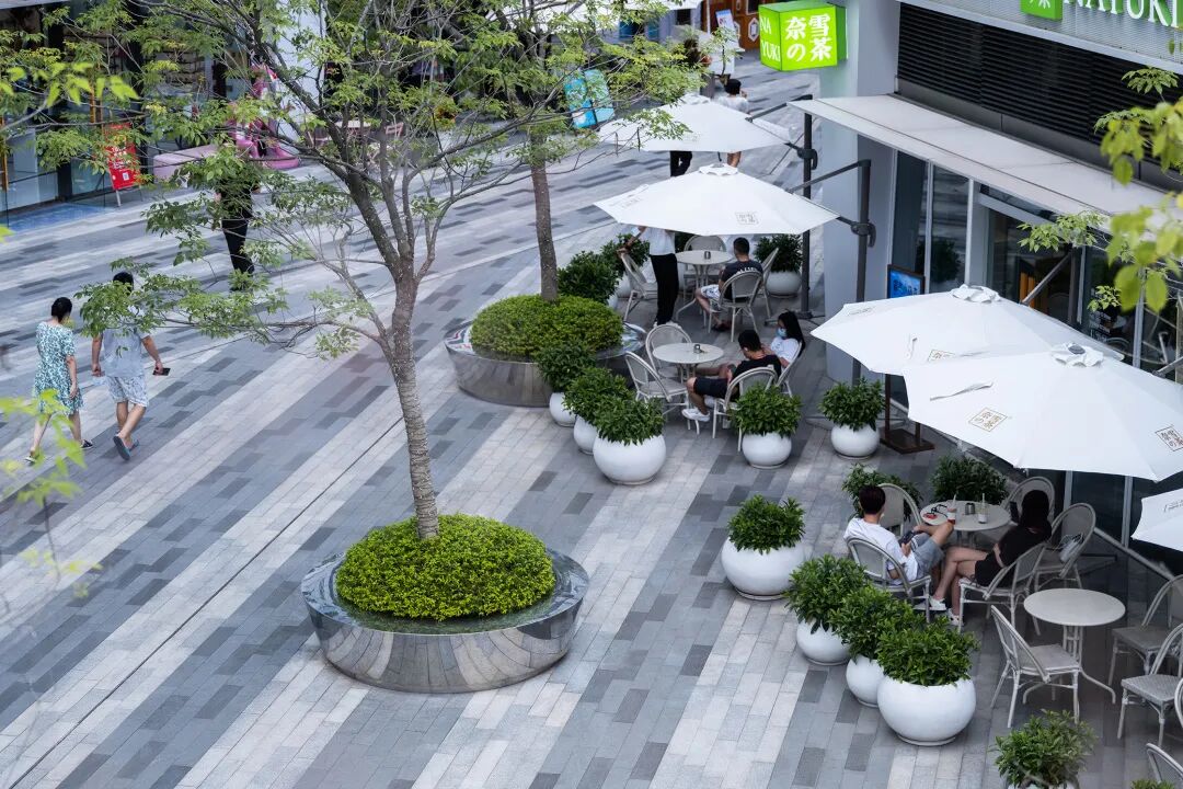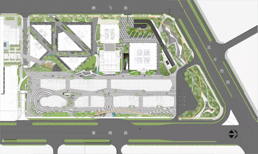 以对角线斜插街道的总部楼群成为了热闹的商业区的背景,折线形的商业建筑体量成为了黄阁路界面的主角,商业街的端点是个云形的建筑单体。为了继续景观与建筑的对话,团队用折线形的条带把商业人流从各个主入口带入了商业街,把各个体验的节点串联起来,在商业街的端点,铺装条带在这里转变成了万花筒的漩涡。这些折线性条带好比是万花筒里面的分隔棱镜,访客们沿着折线走着走着,突然折线小小的错动一下换了个方向,就像好奇的孩子转了转万花筒,在纷纷飞花之间,斗转星移,步移景异。