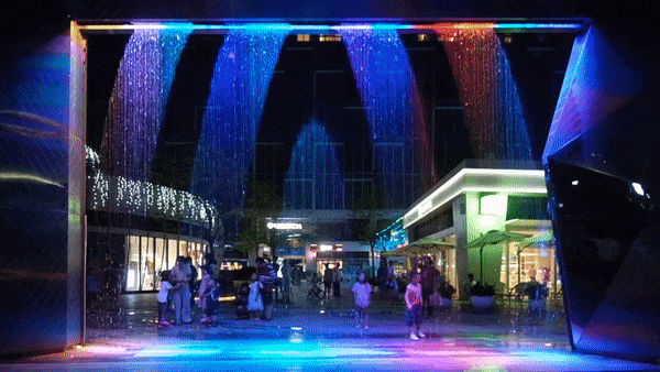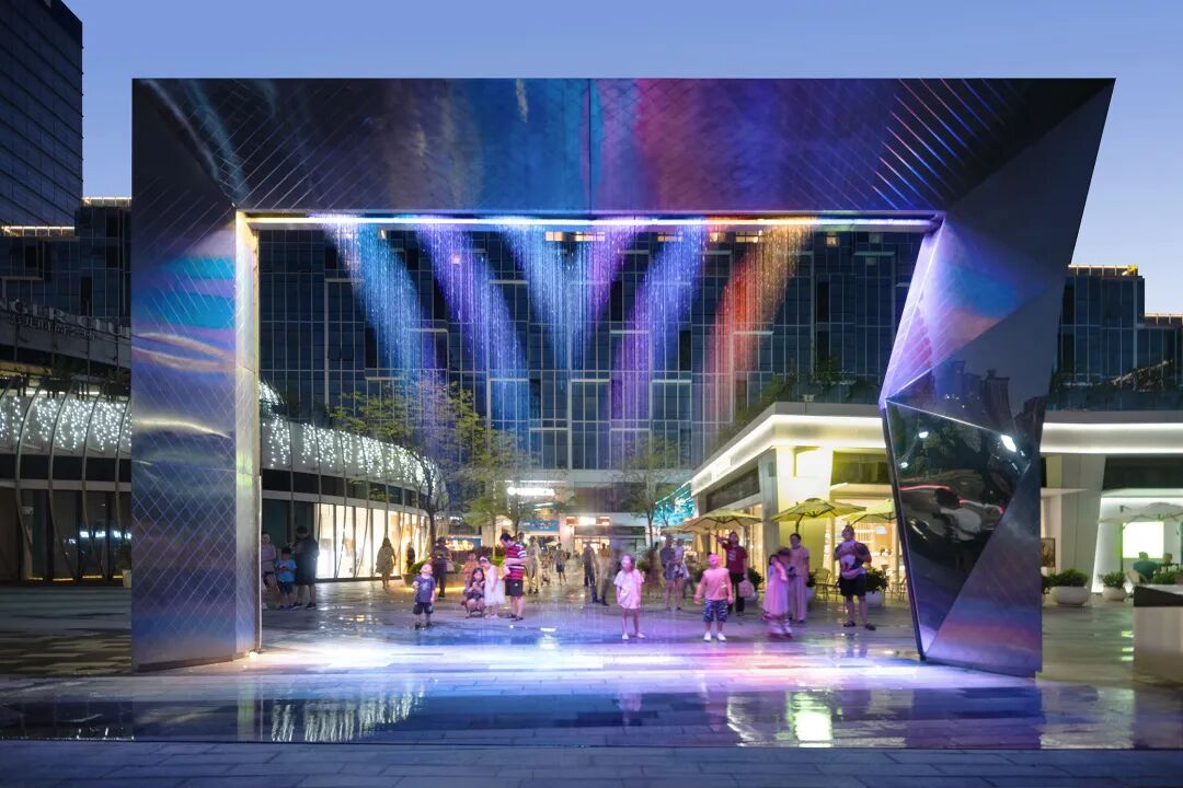 不锈钢水景的饰面,反射着沿街不断变动的灯光,像万花筒不停变换地折射,吸引了孩子们上前探个究竟。这里需要一个特殊的节点来解决梯形转角出现干水的问题,设计团队利用了雨链的原理设计了一个小细节——用一组水台阶把给水均匀地补充到突出的梯形折角处。