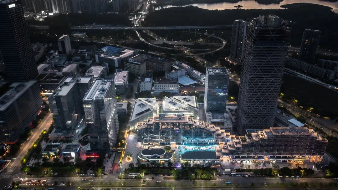 天安数码城带有鲜明的建筑形象:锐角的建筑内街以对角线斜穿场地。层层叠叠的退台,骑楼和灰空间形成了三维的矩阵格局。设计团队希望可以用景观的手法来彰显和衍生建筑的几何构成。和建筑的铝板玻璃幕墙不同,景观在这里成为了充满色彩和温度的多面棱镜。在景观的层次里,建筑也生发了表情,增加了人们可以体验的小展台。因此,设计灵感来源于这样的多面棱镜,从概念初始团队就称之为万花筒——多彩的镜片在万花筒的无数次反射和折射中,绽放出琳琅满目的图案。平面与立面、镜面与磨砂面、几何与曲线不断地穿梭往复,打造出光怪陆离的空间体验,同时又在这个万花筒里浓缩了天安企业与当地的文化,充满着浓浓的人情味。