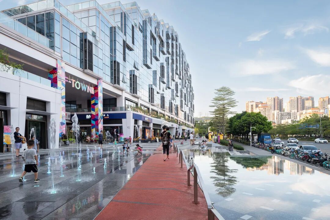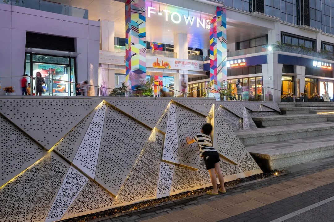 商业综合体面向黄阁路展开,黄阁路和商业界面之间有1.5米的高差,团队设计了进退有致的种植池来消化这个高差变化。在商业入口区的种植池区,嵌入了一组迎宾大台阶和互动水景。访客们从不锈钢折面的跌水面之间拾级而上,登上台阶的高处,带有几何形状池底的镜池映入眼帘,继续商业入口延伸,营造迎宾的气氛。