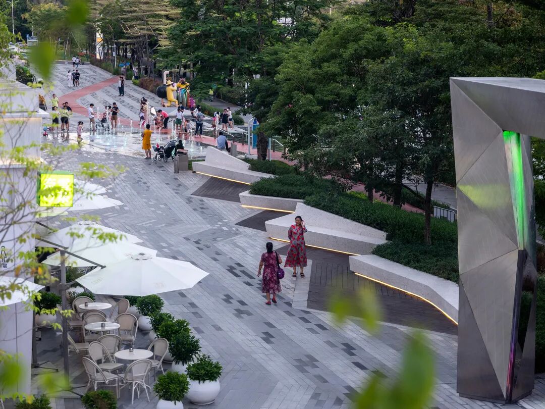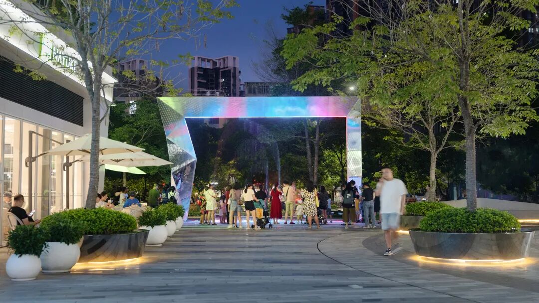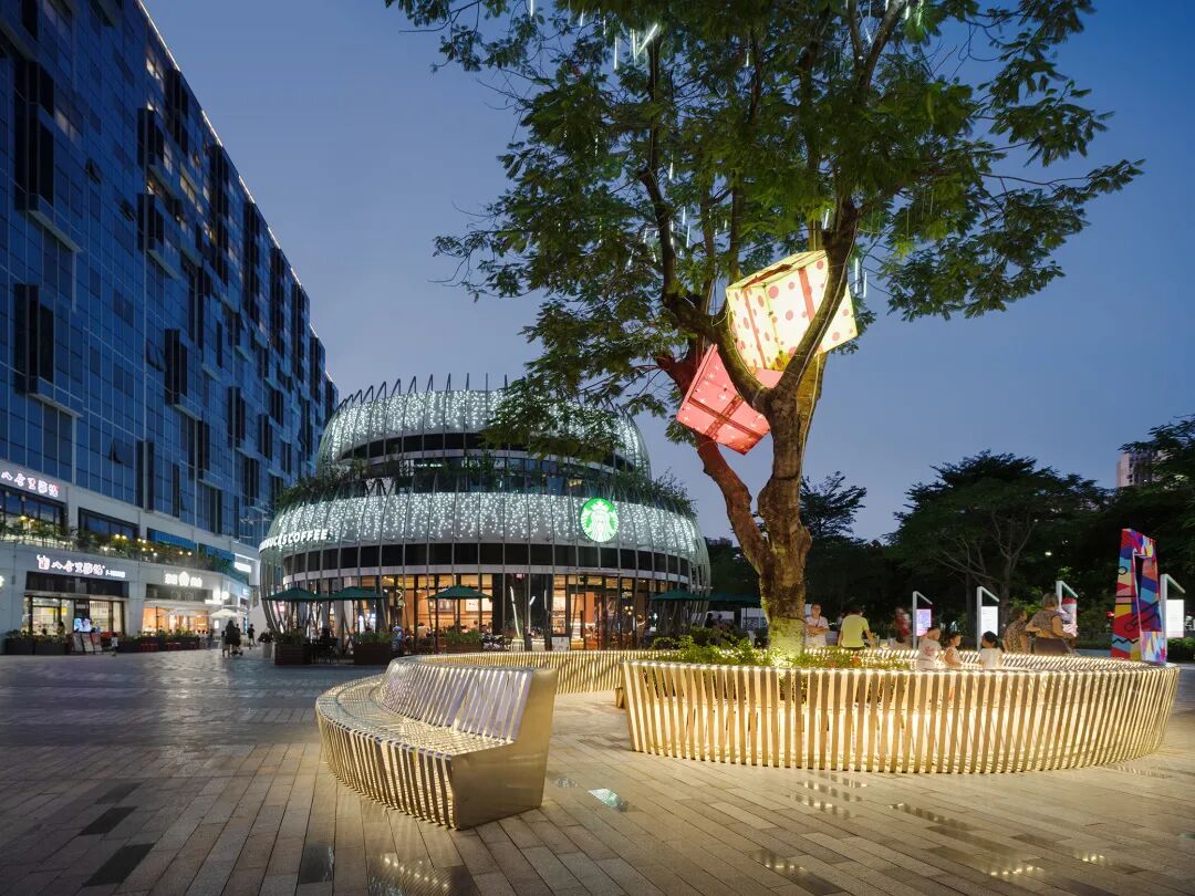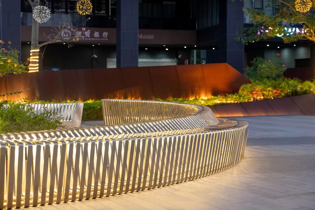 商业内街也设置了圆形的镜面坐凳植池,把周围的铺装与活动场景变形并重现,展现出不断变幻的景象。围绕着一棵凤凰木并从内里发光的镂空坐凳,通过小小的开口邀请小朋友们到里面绕一圈。坐凳的线条也与背后的云形建筑单体相呼应。
