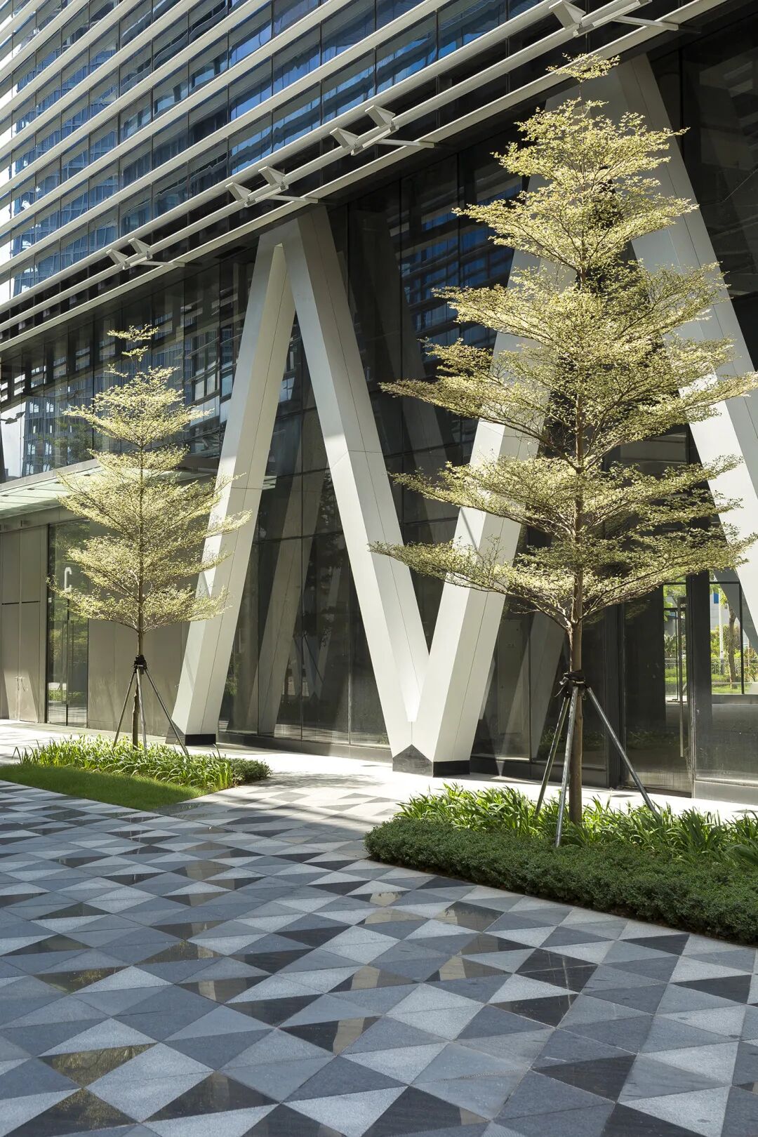 企业园建筑物周围的热点区采用了方形的铺装,而行人的主要交通空间,用了直角等边三角形跳色的铺装来和建筑的形体呼应。直角三角形的不同灰度的跳跃感是通过黑白灰的石材以及石材的不同完成面来实现的。其中最深的黑色三角形经过反复测试,最终挑选到了山西黑抛光拉槽面。这个0.5cm深度的拉槽可以让材料在岭南的艳阳天下形成强烈的阴影,让色度最深的抛光面更加深邃。