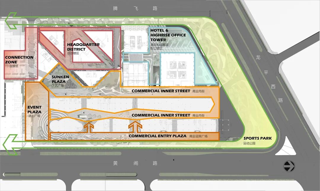 场地的北侧是一个和公交首末站结合的运动公园,东西两侧利用城市道路的退界线与建筑之间的空间打造出了临街线型公园,南侧为活力广场和连接数码城三期的步行走廊。这些城市开放空间连成了的整个园区的活力环,包围着贯穿园区南北的两条商业内街、坐落在较安静的西南角的总部楼群和西北角的酒店加超高层办公楼区块。