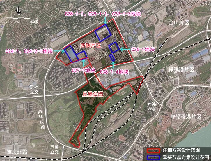2.丘堡公园详细规划范围:北至加工区二路,西至内环快速,东至金渝大道,南至现状铁路,面积约0.7平方公里。