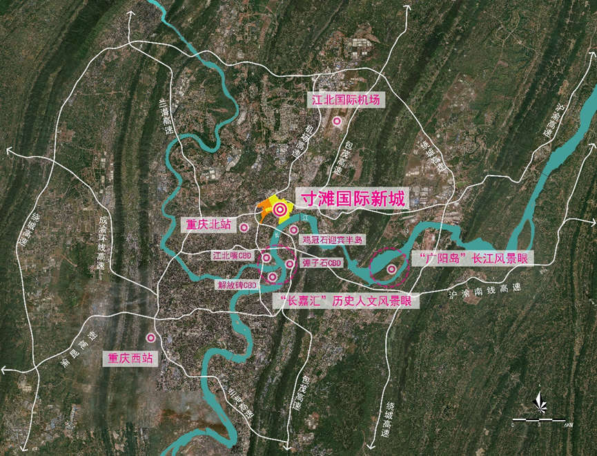项目位于重庆两江新区南侧滨江地带,与鸡冠石迎宾半岛隔江相望,设计范围包括寸滩国际新城片区(金山片区、保税港片区、邮轮母港片区)和丘堡公园。距重庆北站直线距离约3公里,至城市核心CBD、江北机场均约20分钟车程。(详见图1)