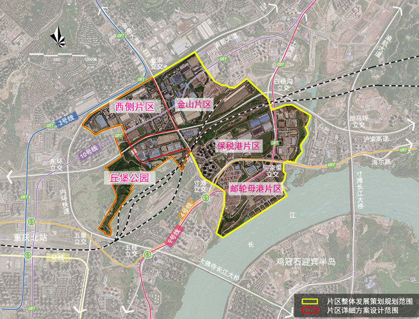 包括寸滩国际新城片区(金山片区、保税港片区、邮轮母港片区)和丘堡公园,东起双溪河,西至内环快速,南临长江,北接渝都大道,面积约6.7平方公里。
