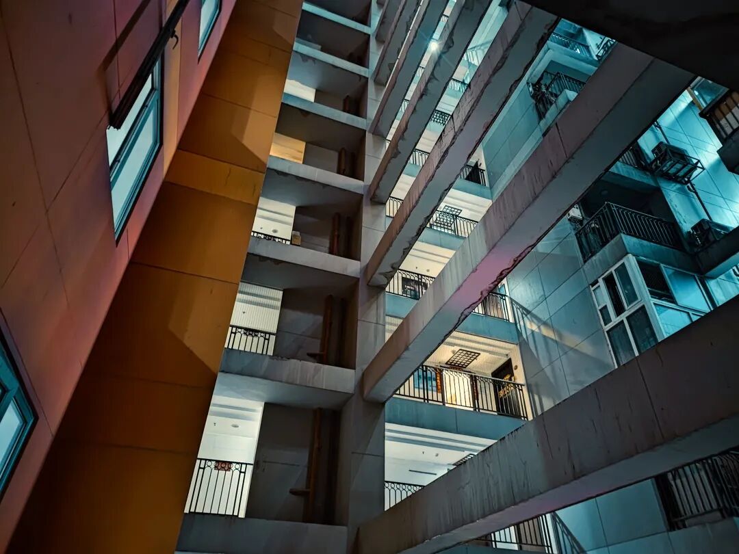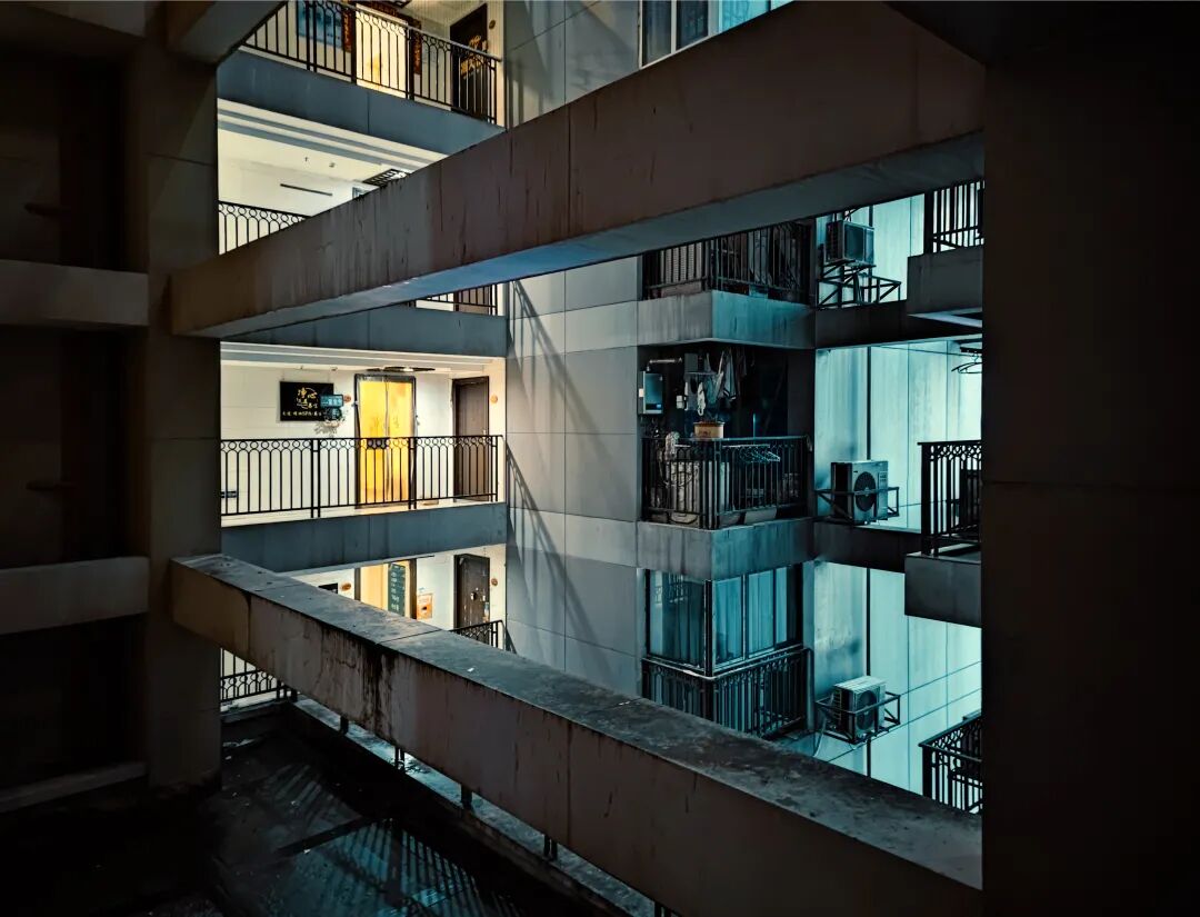如果你看过一部法国悬疑电影《登堂入室》,那你一定对结尾的镜头感到熟悉:千篇一律的窗洞内部,演绎着形形色色的人间喜剧或悲剧——而站在红鼎国际的楼道中往对面看,你也会有类似的感觉。