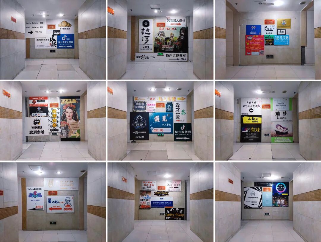 一层往上,可见每层候梯厅两侧都挂满争奇斗艳的广告牌——这是每层的历史文化层,你可以从中考古出些许信息,比方说该层各店铺之间的长幼秩序:又大又靠中间的招牌往往是辈分最老的。而对于后来的店铺来说,靠上的位置总是比靠下强,而招牌大小往往比左右位置更重要——我的推断有理有据:因为我总是看到挂在右边的牌子箭头却向左打,但却获得了更大的牌位面积。相比之下,安全出口和门牌标识显得磕碜了许多,勉强地提醒着游客们这栋楼原本的住宅属性。