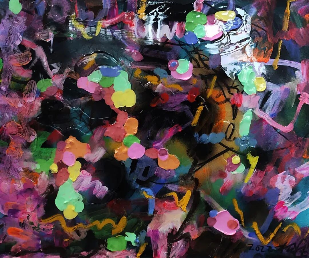 一个由艺术家创办的空间成为培养下一代艺术家成长的摇篮,这是我们乐于见到的。甚至,在疫情来临前,器空间还是一个国内外艺术空间互换驻留艺术家的重庆“非官方”的对外艺术交流平台。这种“交流”属性可以追溯到1995年,研究生毕业不久的杨述获得了去荷兰学习的机会。“他在城市间漫游,他终于发现并真正爱上了公共场所的涂鸦。”¹ 其实在89年毕业后,杨述就已然开始在画布上涂鸦,至今已经持续了30余年。与早期的创作相比,1995年以后的作品,开始呈现出一种面对西方文化强势袭击后,在内心慌乱、叛逆状态下,回首中国符号与文化的结果。作为一名愈发成熟的艺术家,在经历着事业、教学、展览等生活起伏中,杨述寻找到了属于他的表达路径,以涂鸦为基础,借用生活点滴引领观众阅读纯粹的视觉艺术。正如鲁明军所言:“他并不避讳艺术史和当下流行趣味对他潜移默化的干扰;他亦无所谓画面的好看与否······他拒绝让画面承载任何绘画以外的功能,他认为绘画其实就是表面。”² 即如何做好一种视觉艺术的追问成为杨述的表达逻辑。杨述的画面没有冗长的叙事,仅靠其中一星半点的形象与色彩便制造出与其气质相符的流畅感与松弛感。