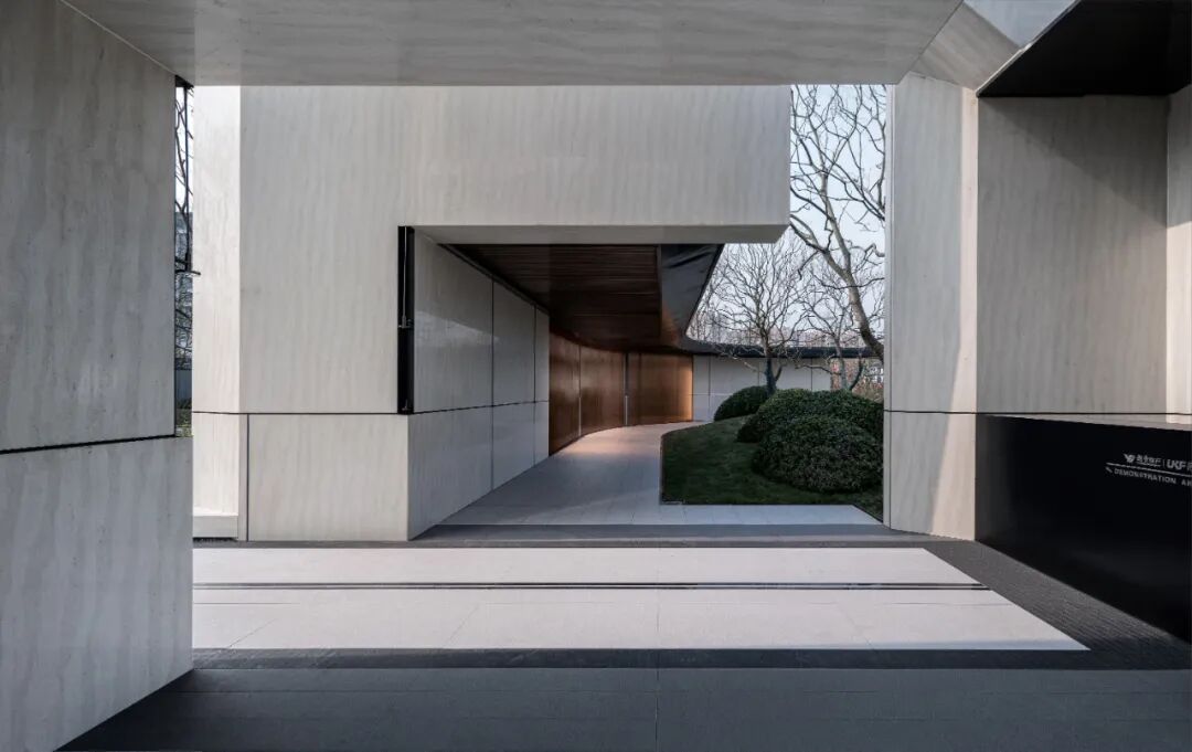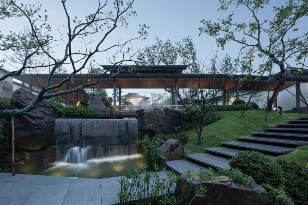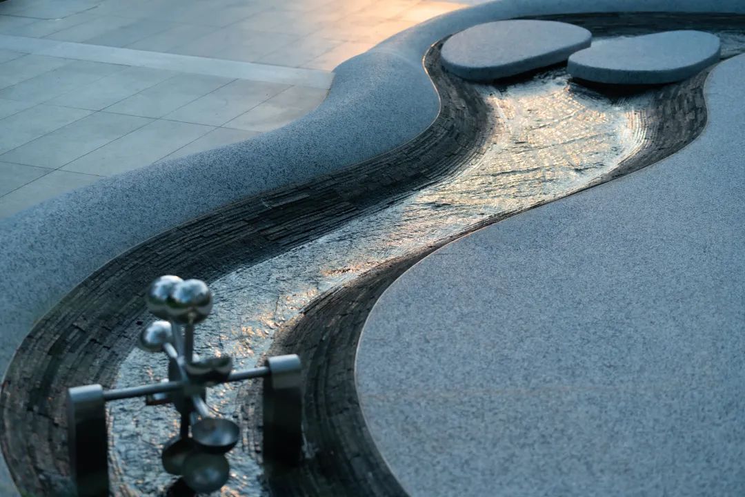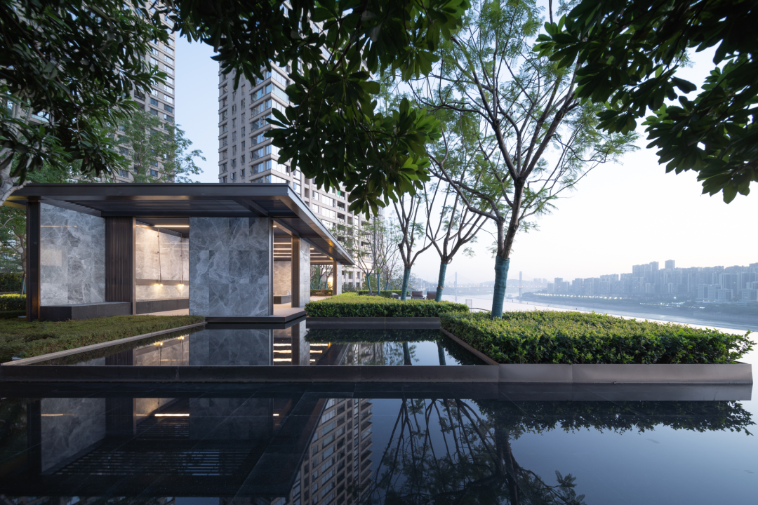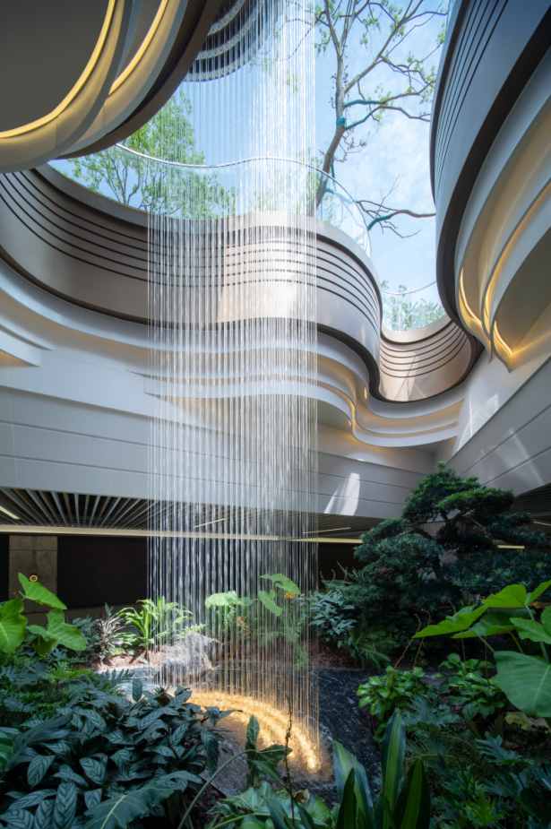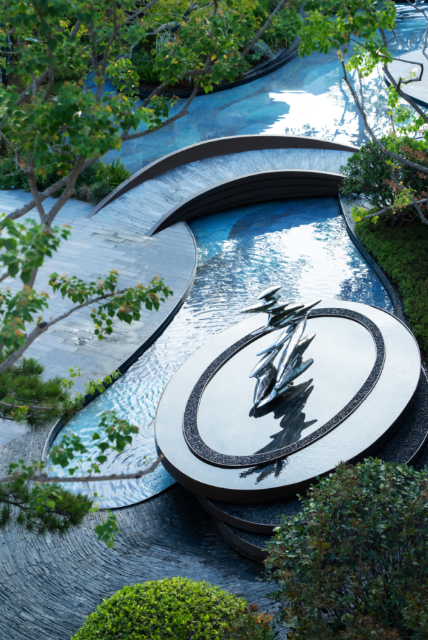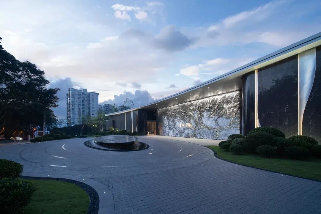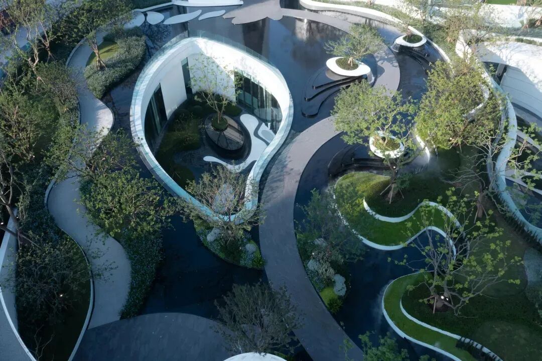 设计在原有概念设计的基础上,重新精修标高梳理、空间与场地设计,抽取山水的几何形态,将群山与江流用景观流线与形态重新演绎。在立面上利用连绵起伏的山形线条,平面体现顺滑柔和的水形曲线,将山水元素融汇至中。