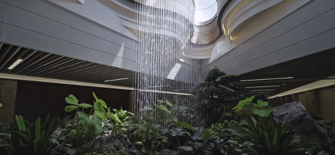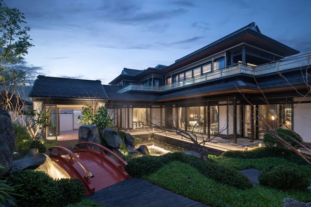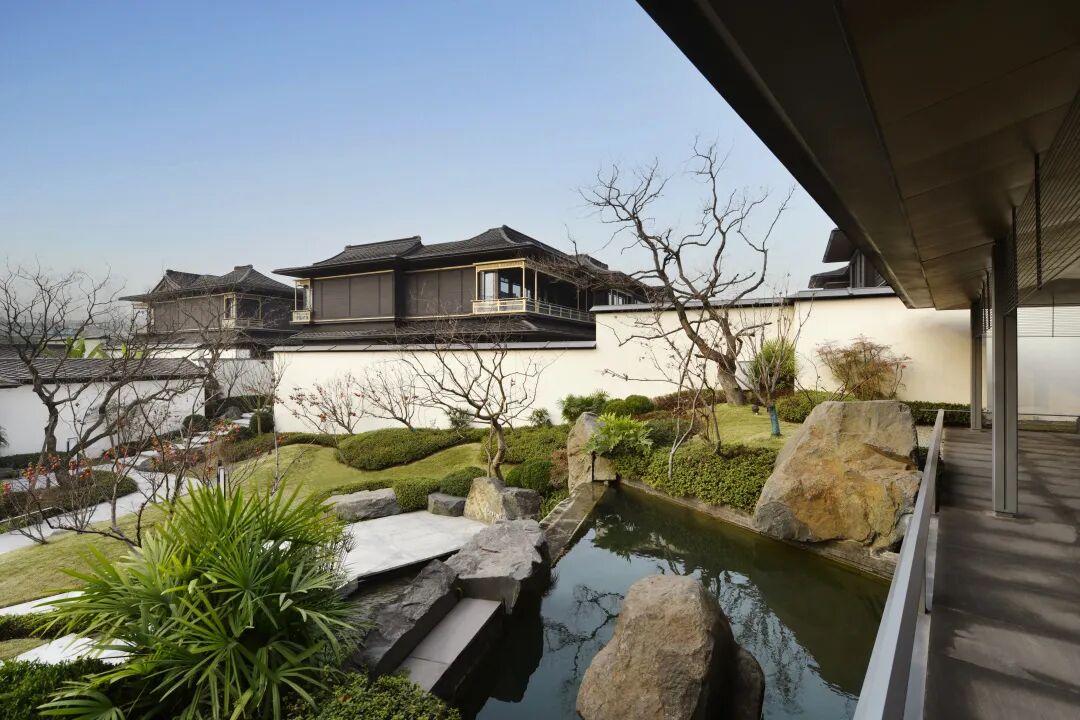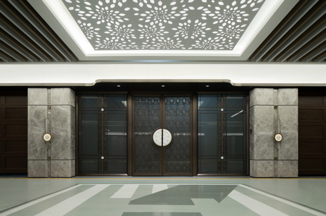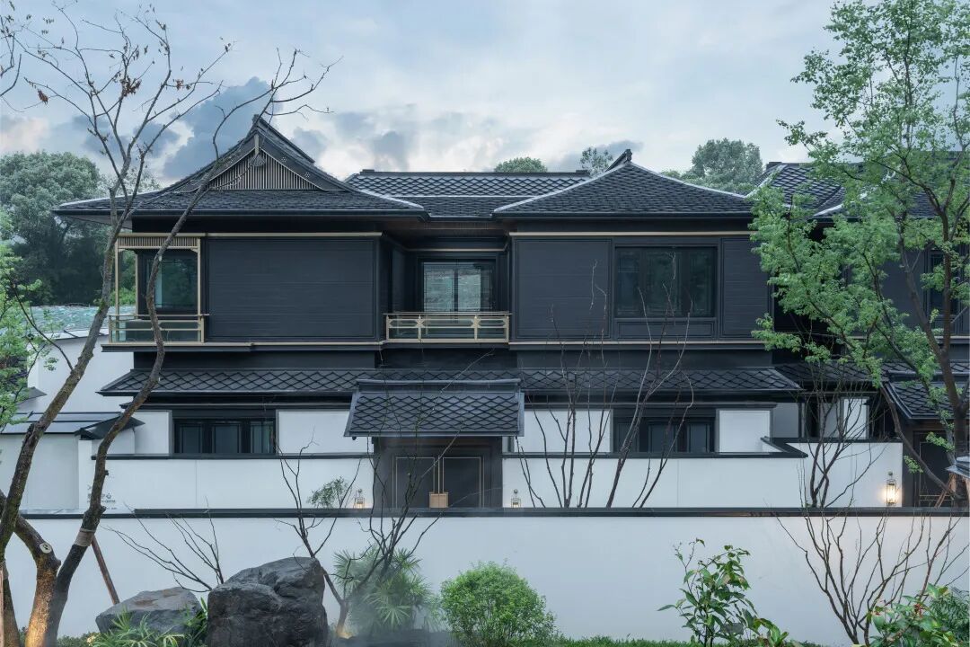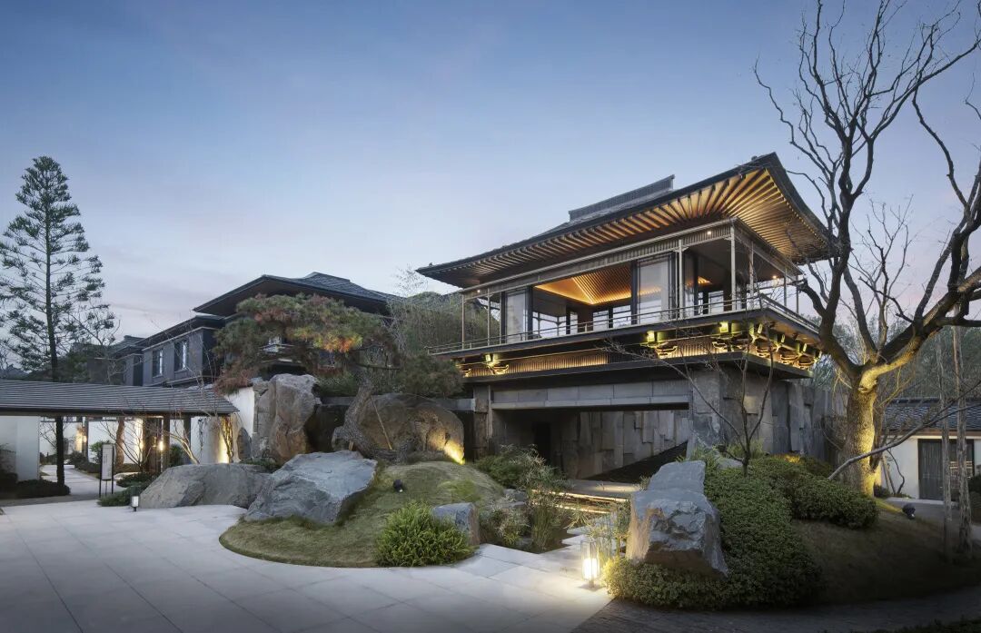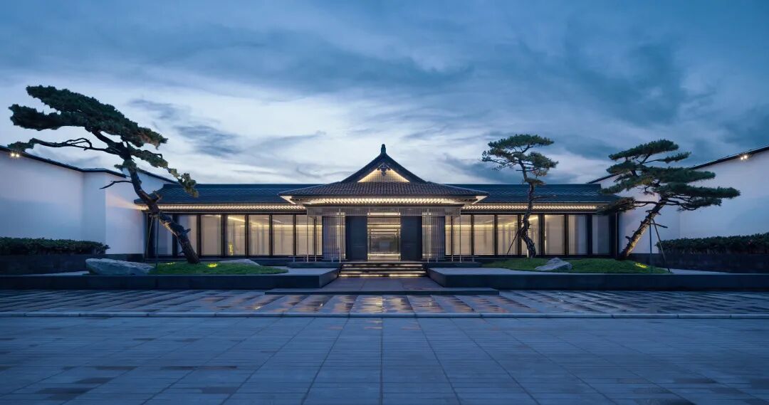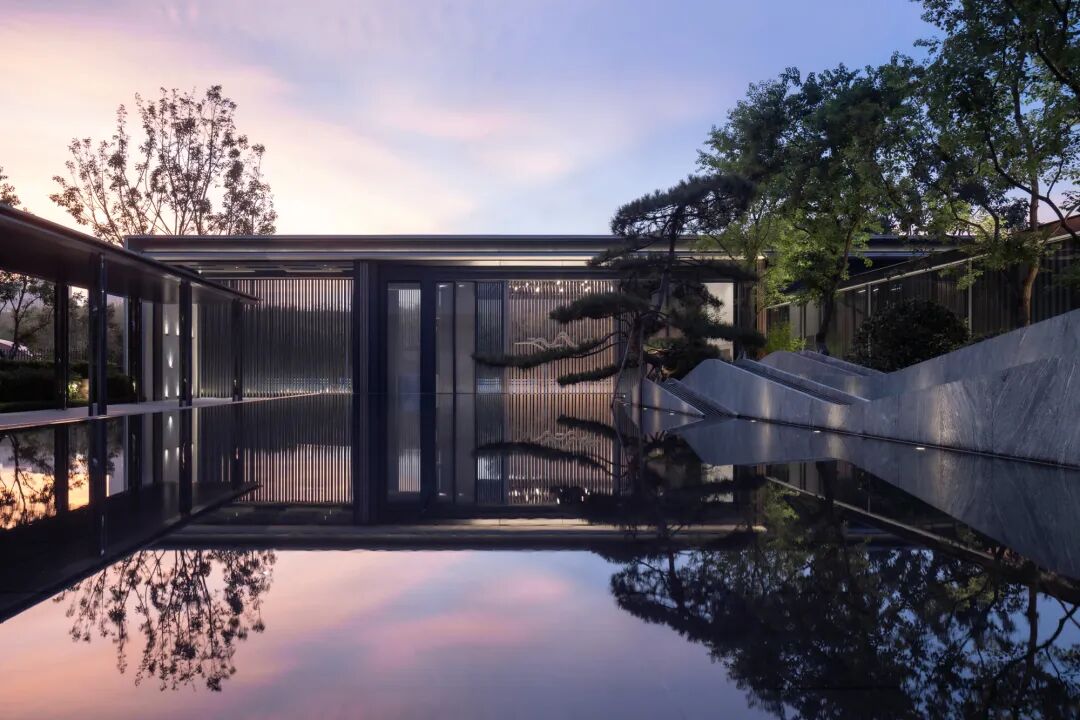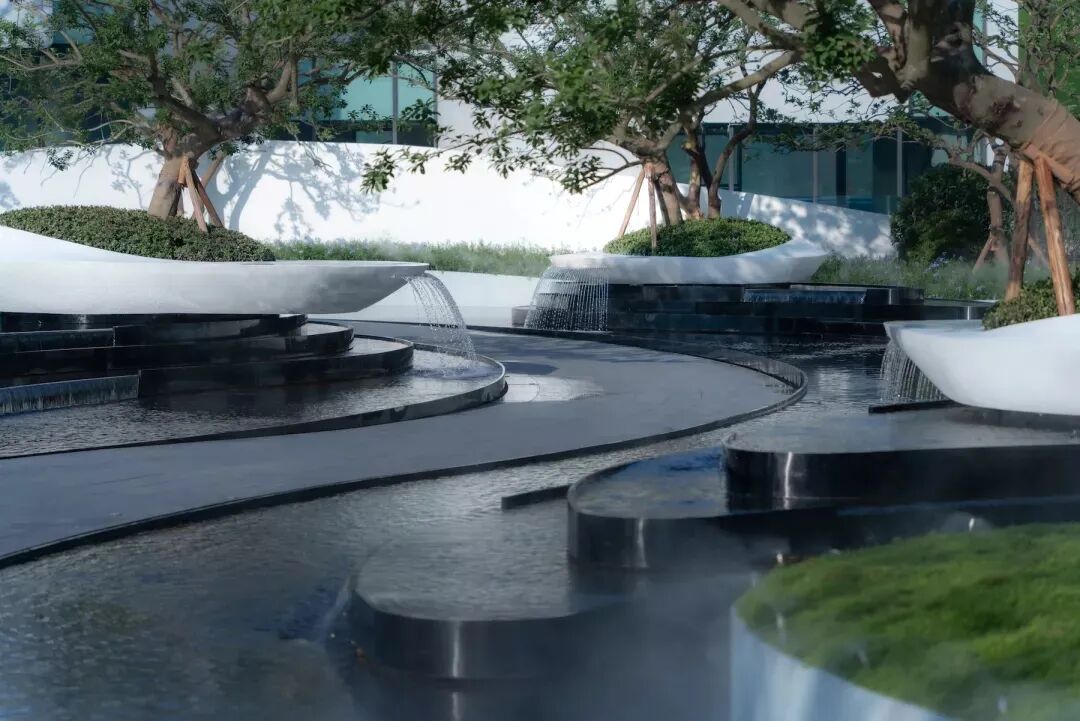 设计在原有概念设计的基础上,重新精修标高梳理、空间与场地设计,抽取山水的几何形态,将群山与江流用景观流线与形态重新演绎。在立面上利用连绵起伏的山形线条,平面体现顺滑柔和的水形曲线,将山水元素融汇至中。