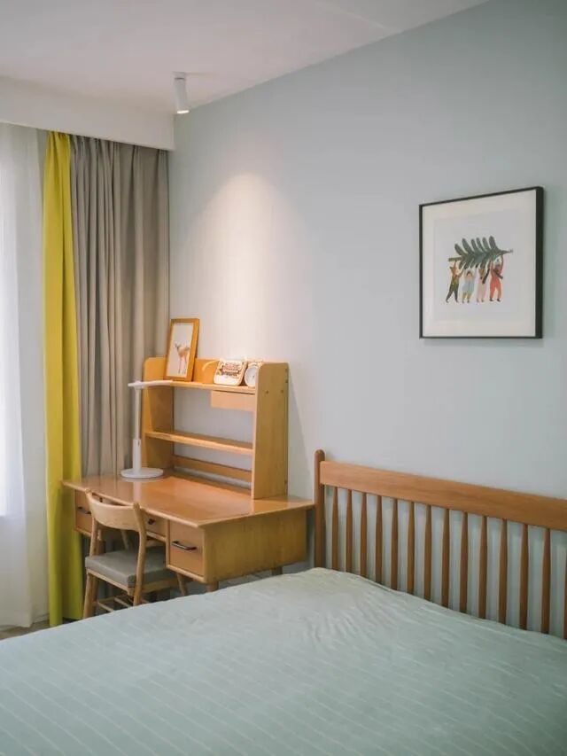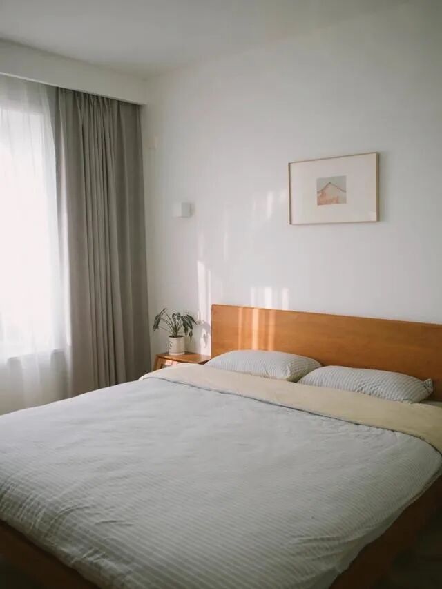 卧室依旧选择了大白墙+鱼骨拼木地板的设计,外加灰色格纹床品,床尾安装了一个斗柜,满足收纳需求,又营造了一个舒适的睡眠环境。