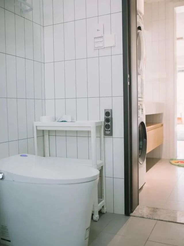 灰色哑光地面瓷砖,白色的一体岩板洗手台,小白墙砖,这些元素搭配在一起,显得卫生间干净清爽,内嵌洗衣机和烘干机,不占地方又规整,镜子周围镶嵌了灯带,视野上显得明亮,让人感觉无比舒适。