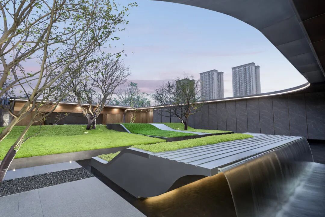 项目大区虽紧临山体公园,但视线与交通的割裂严重;南北高差达近30米,分为三级台地,台地高差同样把三级庭院分隔开来。为了解决两大难题,大区沿用了样板区“引山入园”的概念,横向以山林延伸铺漫把园区内外融为一体,南北纵向,以自然山水的手法,营造3D立面,把阻隔的立面变成山水与链接,化为亮点与特色。