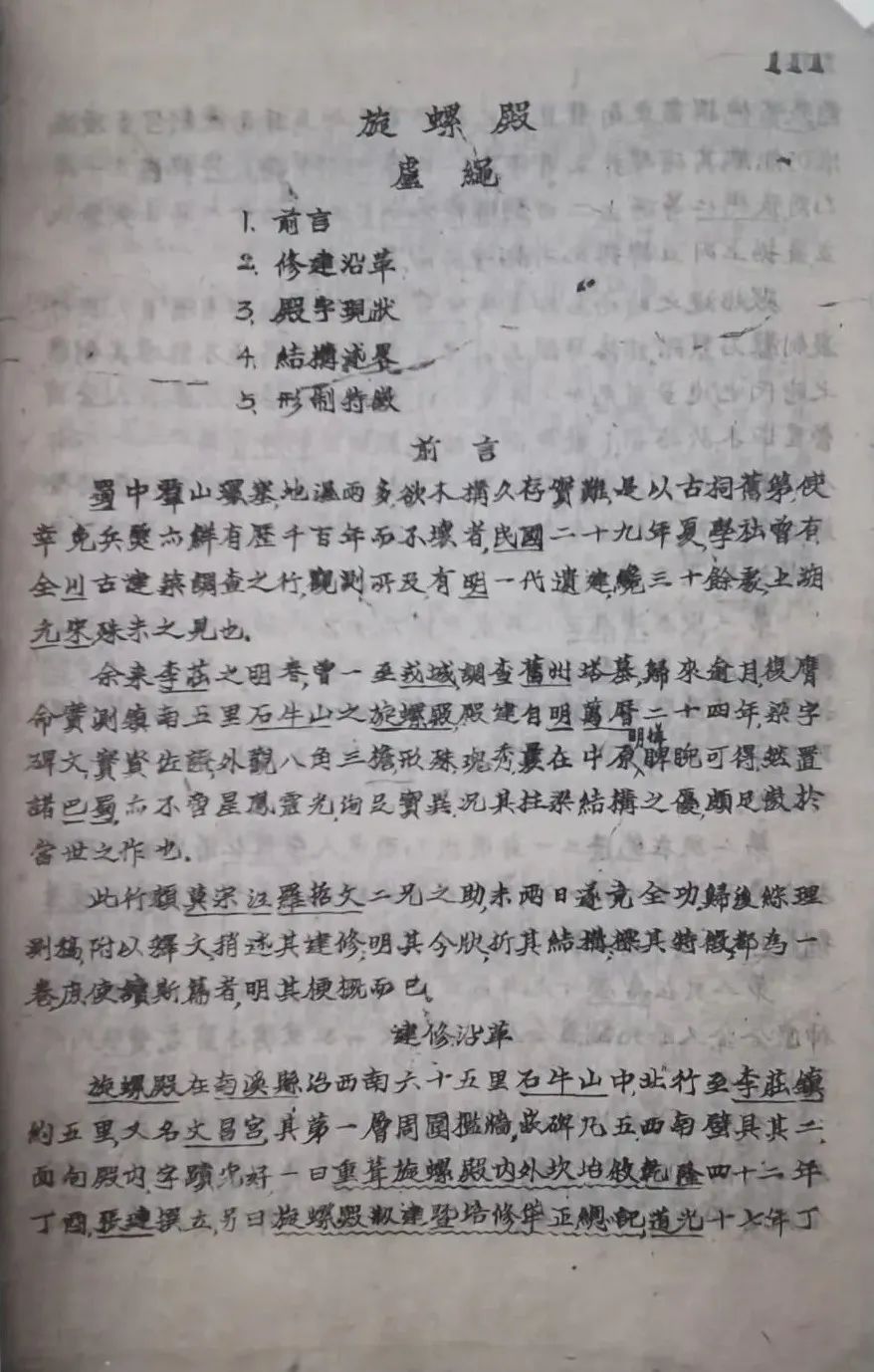 余来李庄之明春,曾一至戎城调查旧州塔墓,归来逾月,复膺命实测镇南五里石牛山之旋螺殿,殿建自明万历二十四年,梁宇碑文实资佐证,外观八角三檐,形殊瑰秀,曩在中原明构睥睨可得。然置诸巴蜀,亦不啻星凤灵光,绚足宝巽,况其柱梁结构之优,颇足傲于当世之作也。