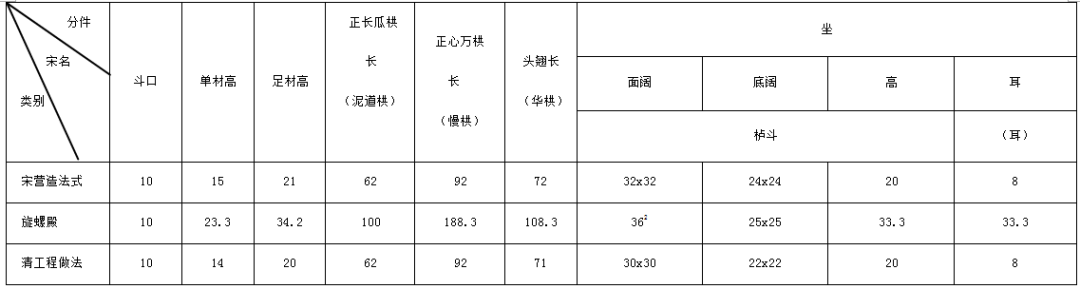 旋螺殿斗栱,与清官式做法相去殊远,最主要者,清官式除角科外,根本无斜翘之制。如清式五彩重翘斗栱,坐斗中线上具正心瓜栱、万栱外第一跳翘头上,有外拽瓜栱、万栱;第二跳上又具外拽厢栱,内跳亦当同之,其上更当垒以蚂蚱头、撑头木及桁椀,而旋螺殿斗栱,里外木跳均无厢栱,外侧第一跳上,仅有万栱而无瓜栱,与宋式之单栱造相同,内第一条上,则仅有三福云或单材瓜栱,而无万栱、蚂蚱头、撑头木等,又付阙如,而以採步梁等补其所应据之位置,正心枋下缘复剜刻如意纹,此与最外跳上午厢栱之制俱如云南元明诸例,他如用材、高广比例、栱之长度、出跳长短、斗之大小及身腰底之比例等,亦均与宋、清官式相去殊远。兹就其第一层入口处平身斗栱之升、斗、栱翘、比例大小列简表,以与宋、清官式比较如下: