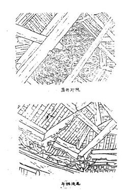 第二层抬梁距井口柱顶不远,顶层檐柱八根,即分立于其上,每侧梁上置柱凡二,柱下亦具穿枋一条,以相连贯,其所构成之八角形与中下两檐亦似,顶层檐柱与梁背相交处,均有角背,长七十二公分,高二十四公分余,并剜刻花纹,今惟存其东西两面,柱顶檐柱平板枋以上,置斗栱,坐斗外侧,为外檐斗栱,内侧构成藻井。