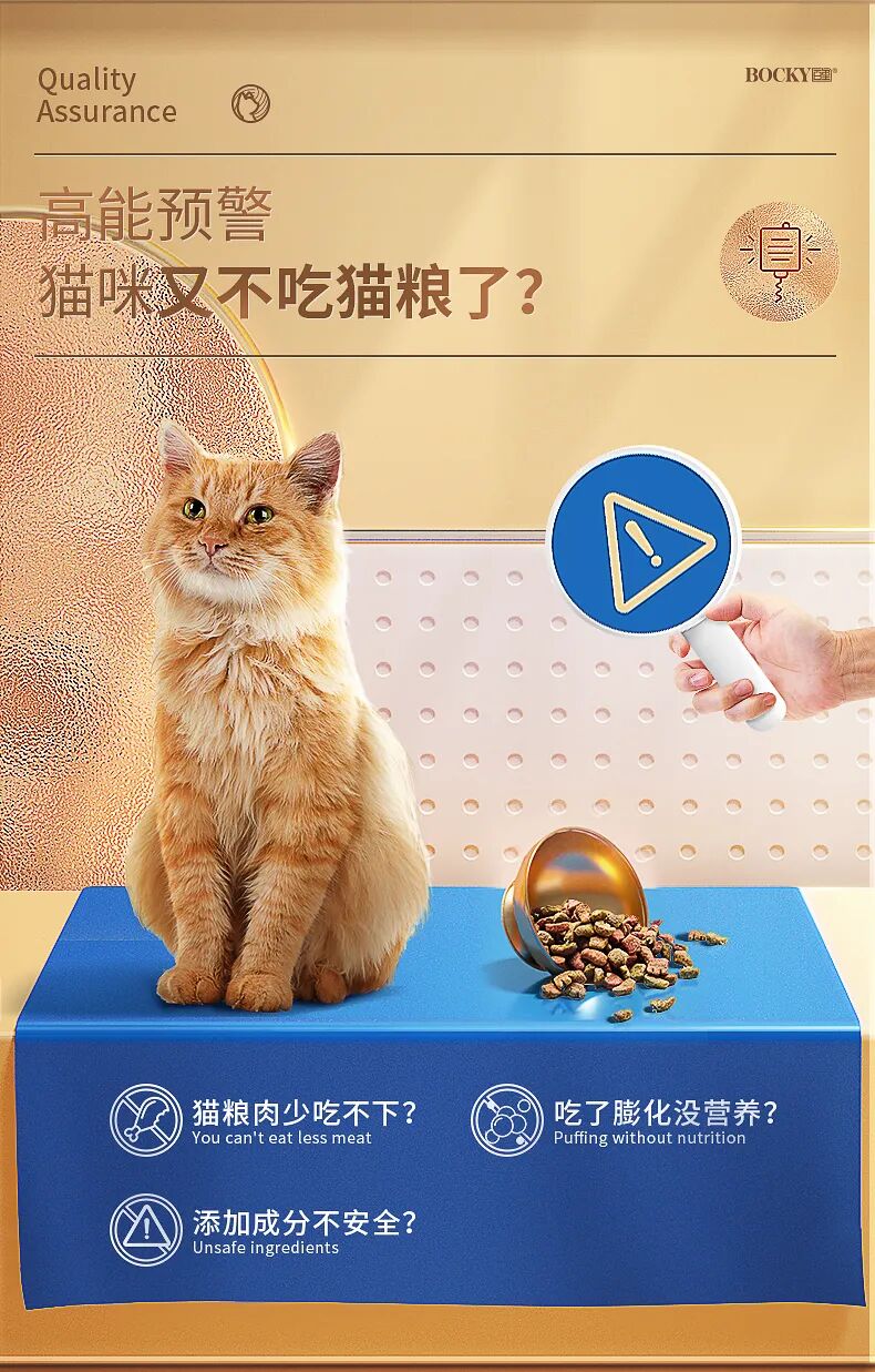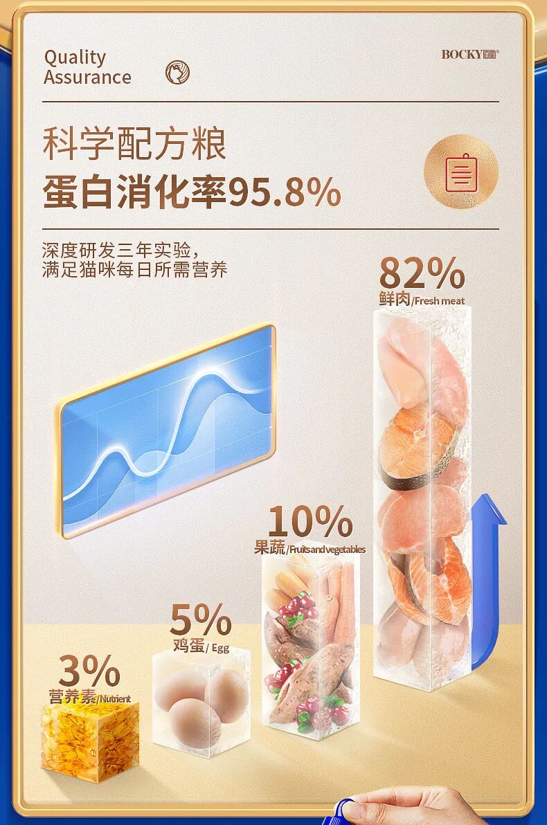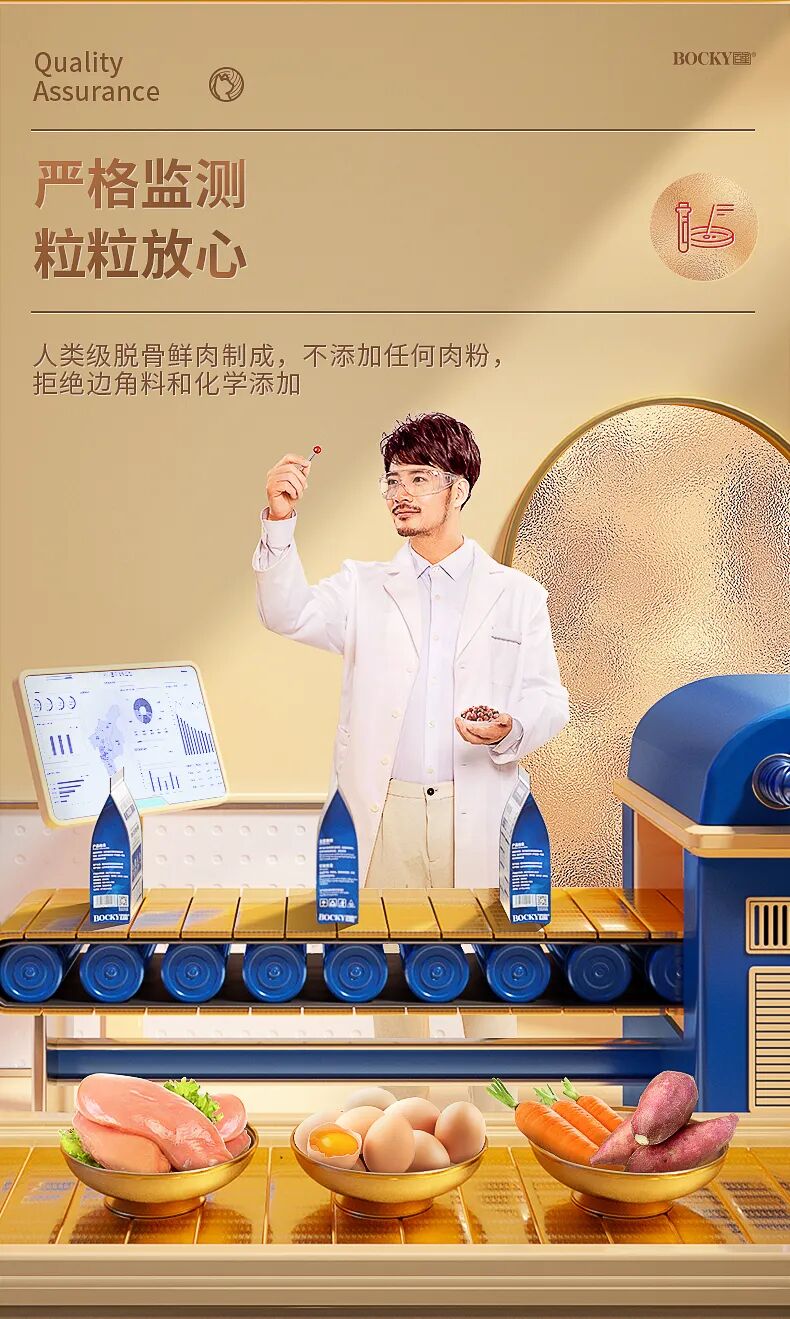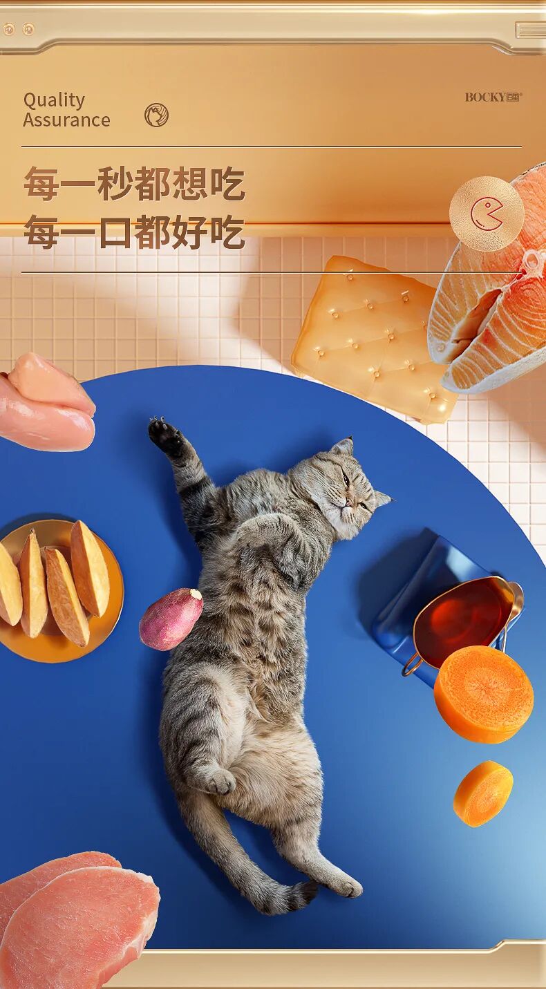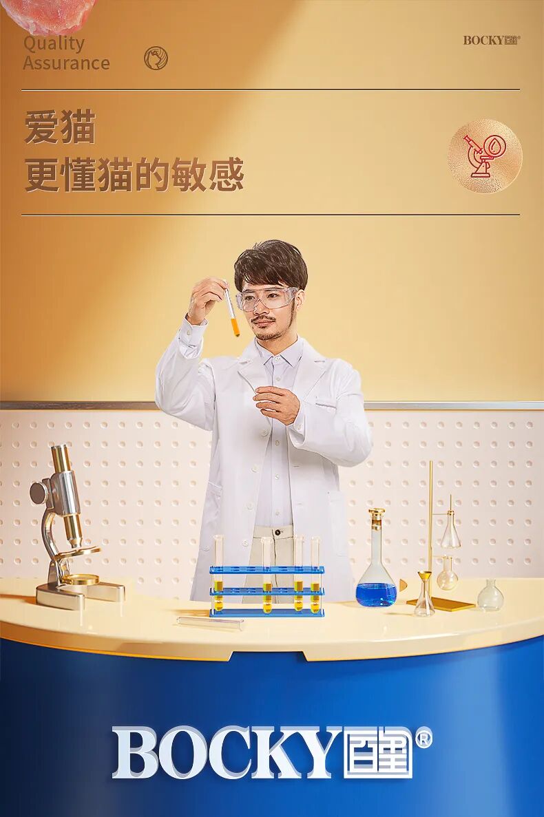 这是一款烘焙猫粮的详情页,与上面的风格截然不同,这款详情页立体空间更强一些,融入了很多科技健康相关的的元素,更强调产品健康属性,模特都穿着白大褂。