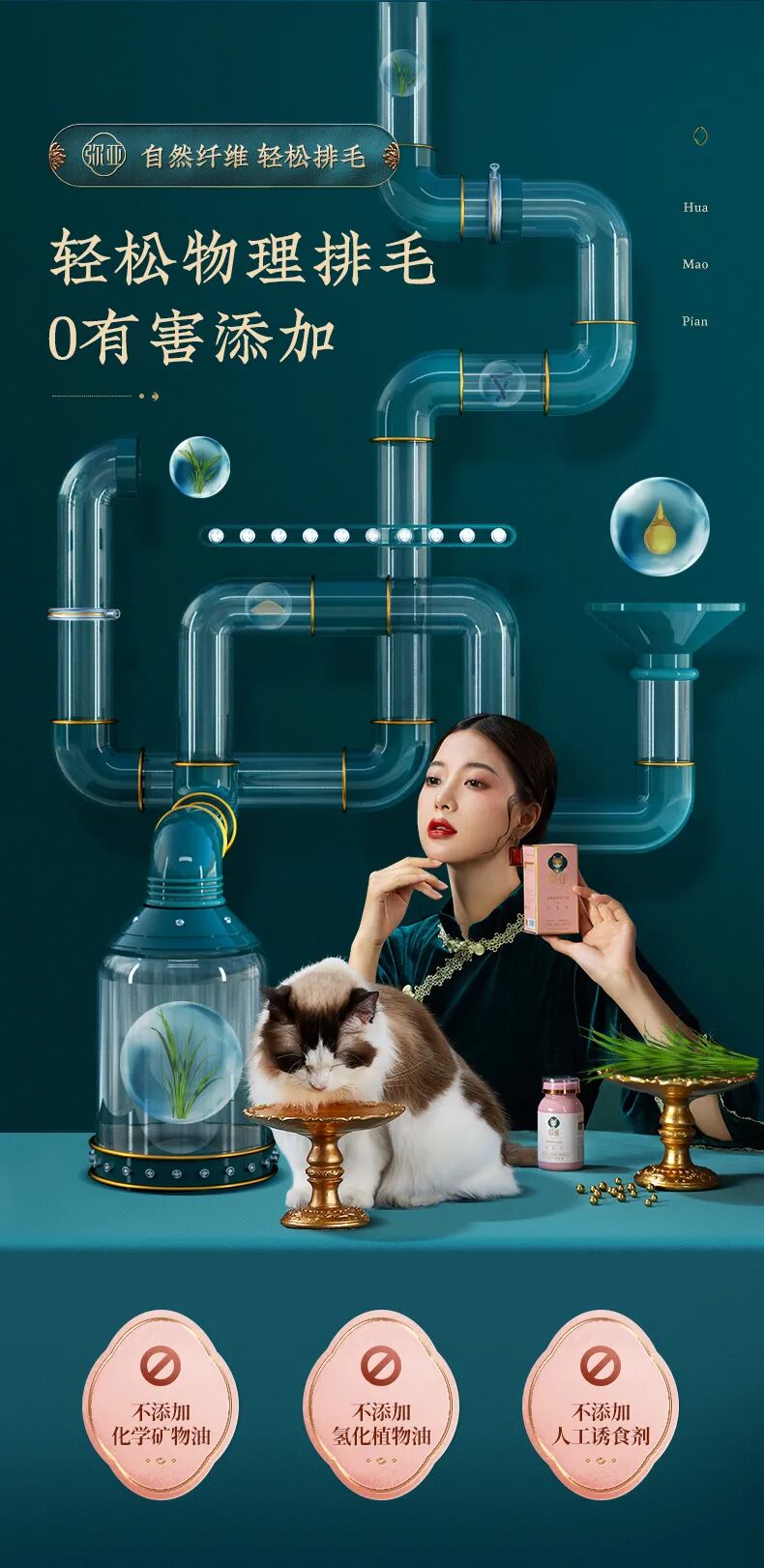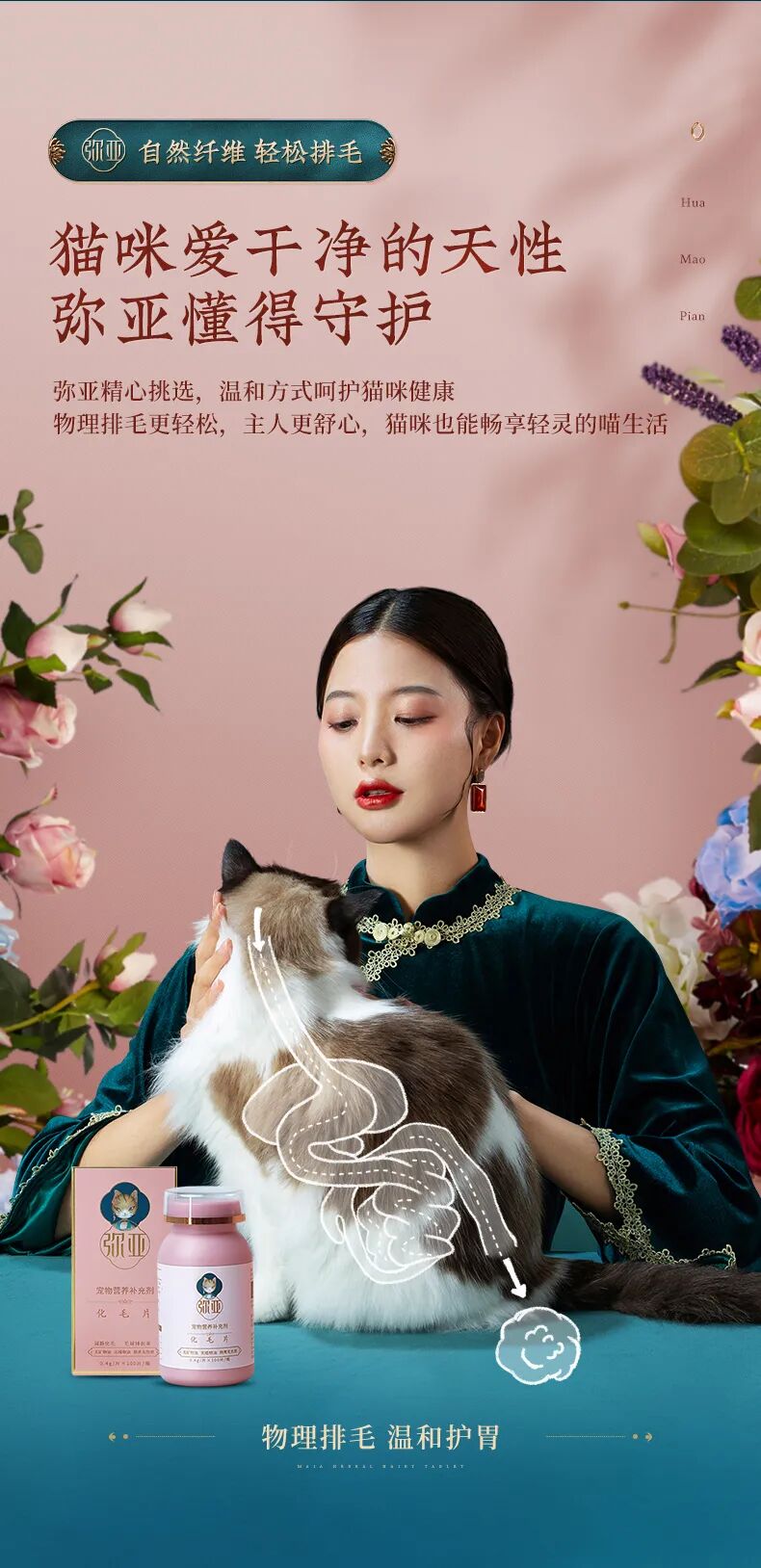 专门呵护猫肠胃的产品,不得不说宠物市场现在越来越专业了,而且也越来越细分了,这款详情页很明显的国潮精致的风格,这也与产品定位有关系,模特的穿搭与猫咪相辅相成,猫给人感觉也很贵气。