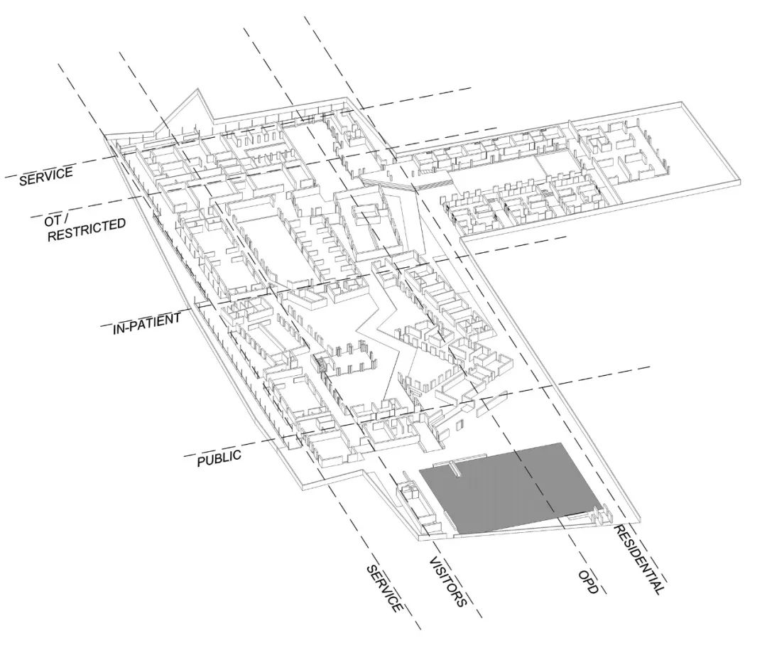 在设计初始最初阶段,为了将住院部和门诊部进行划分,长条形的基地被划分成了两个部分。但是后期运营介入后发现,切分基地的方式将会增加出入口的数量,增加管理难度;