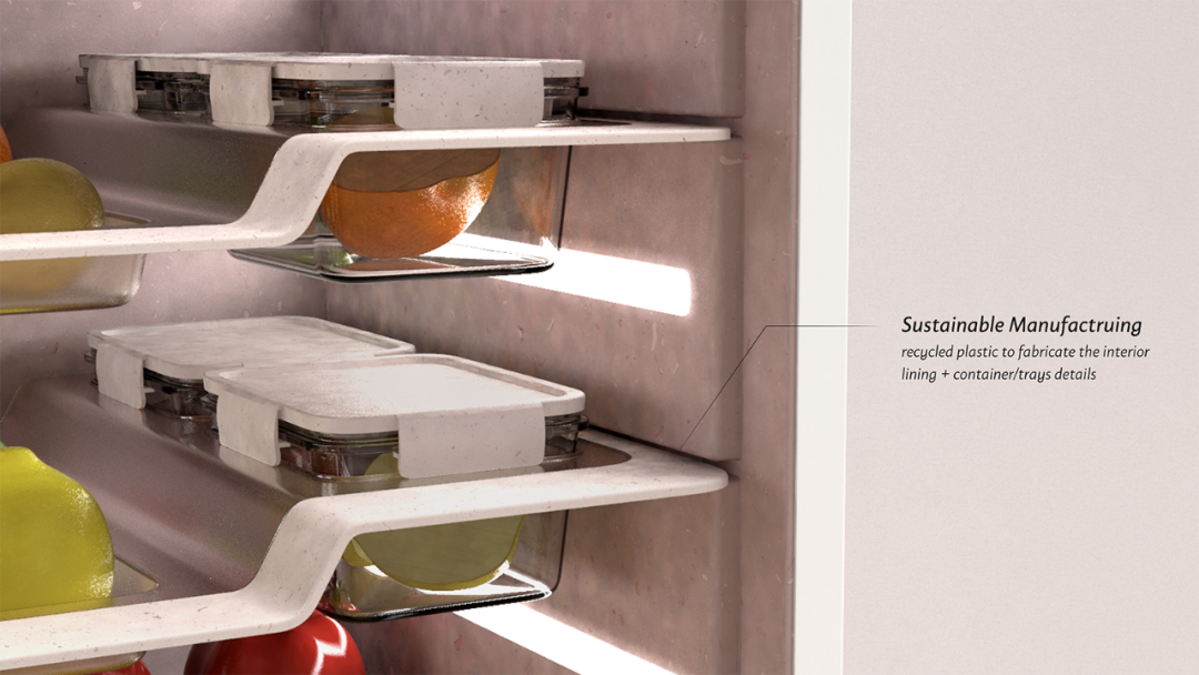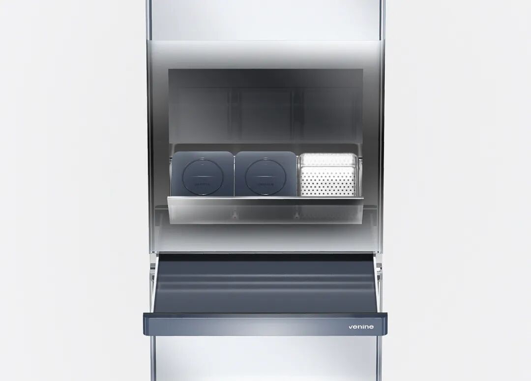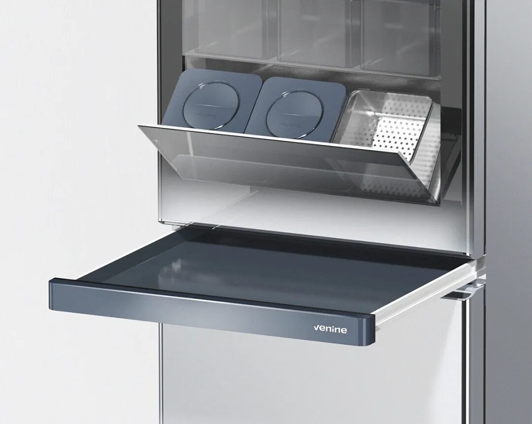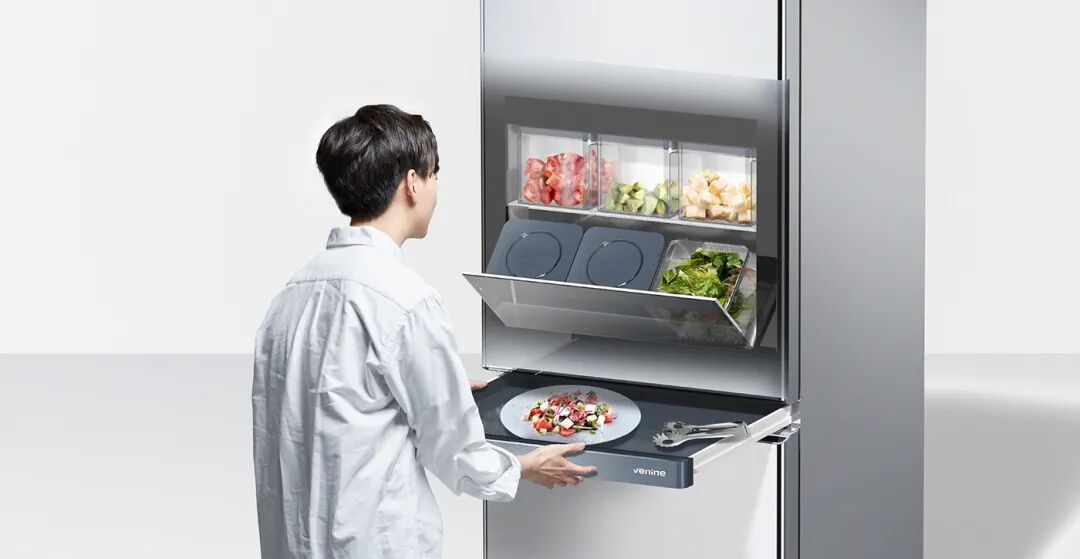 Venine是一款专为年轻人设计的冰箱,设计师在不影响冰箱原本功能的情况下,通过设计来节省用户的时间和空间。交互屏幕可以显示冰箱内部容器中的剩余食物量,冰箱门可以以45度的角度打开,更方便拿取菜品。