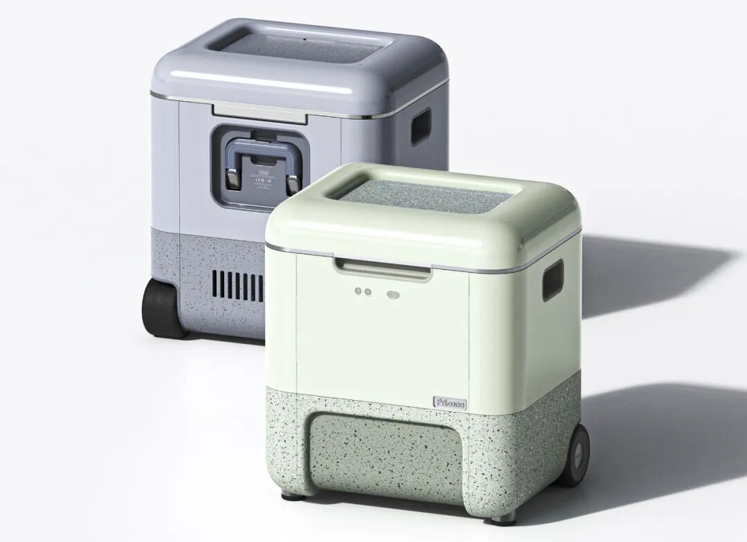 这是一款为宠物设计的便携式无线冰箱,这款产品能够智能的控制宠物的食物量,还能让宠物吃上保鲜的食物,产品整体小巧,外出携带也很方便。