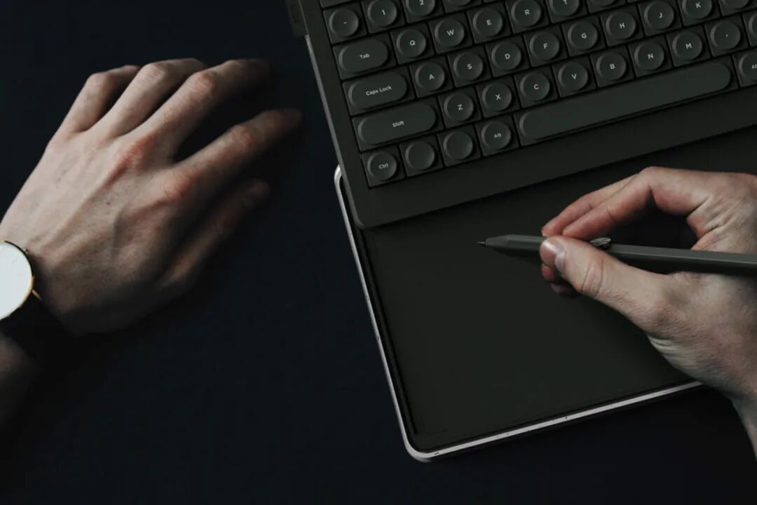 传统键盘和平板同时放到桌子上,会占据办公桌的一部分空间,空间就会变得低效很多。键盘和平板成为同一种产品,可以有效使用空间,当只使用键盘时,平板就会自然而然地成为键盘的一部分,避免占据空间。平板笔的设计与键盘相匹配,可以旋转或按下圆角控件来执行所需的预先设置操作。