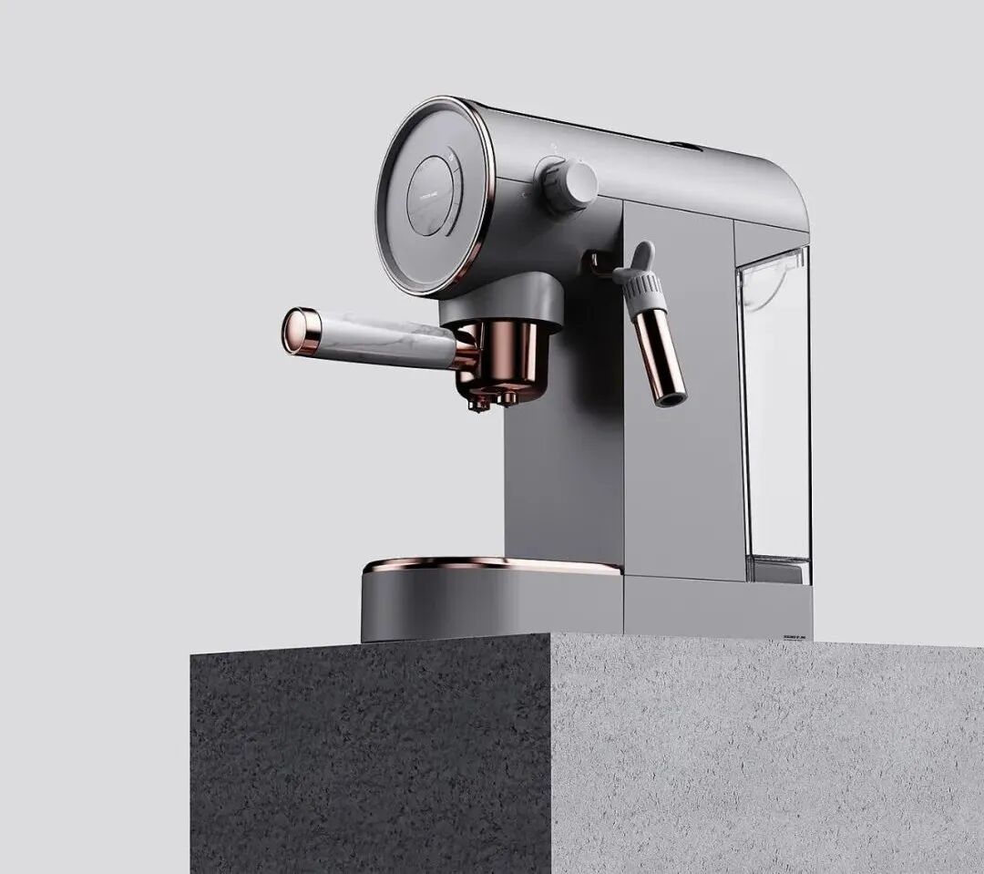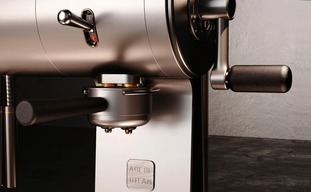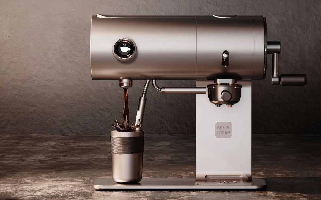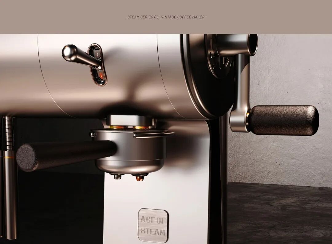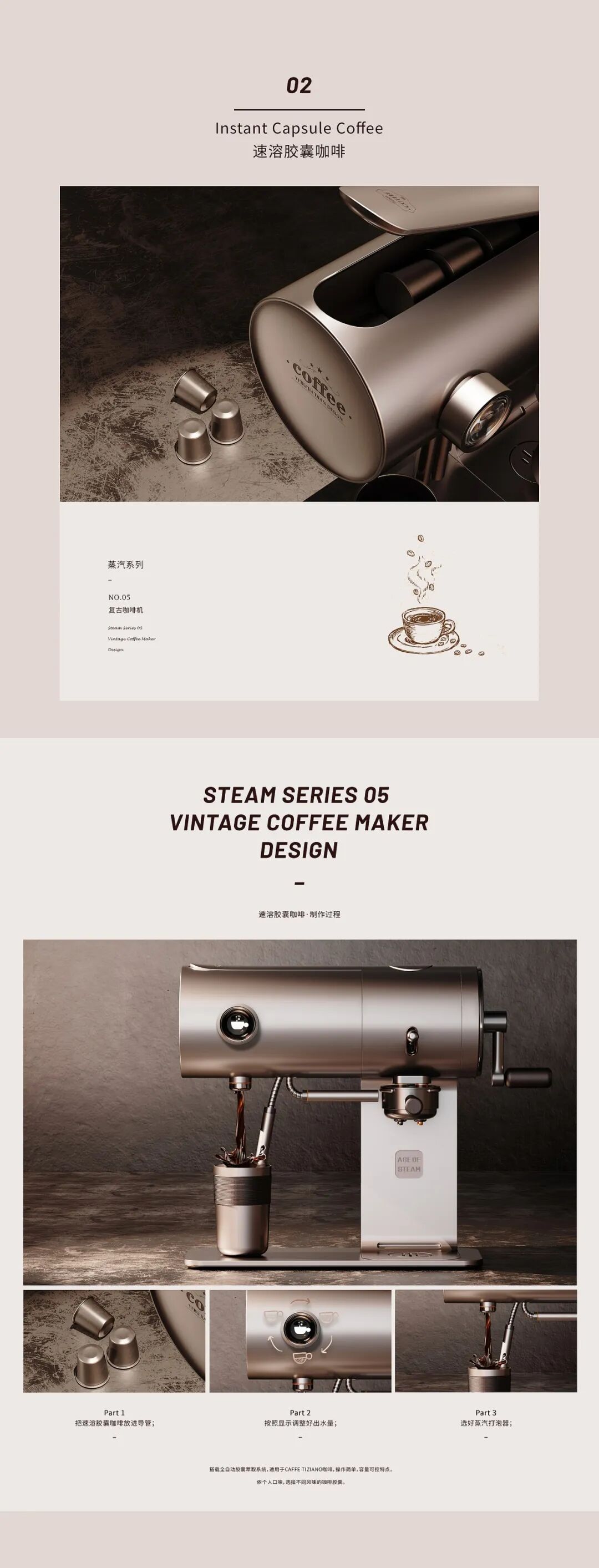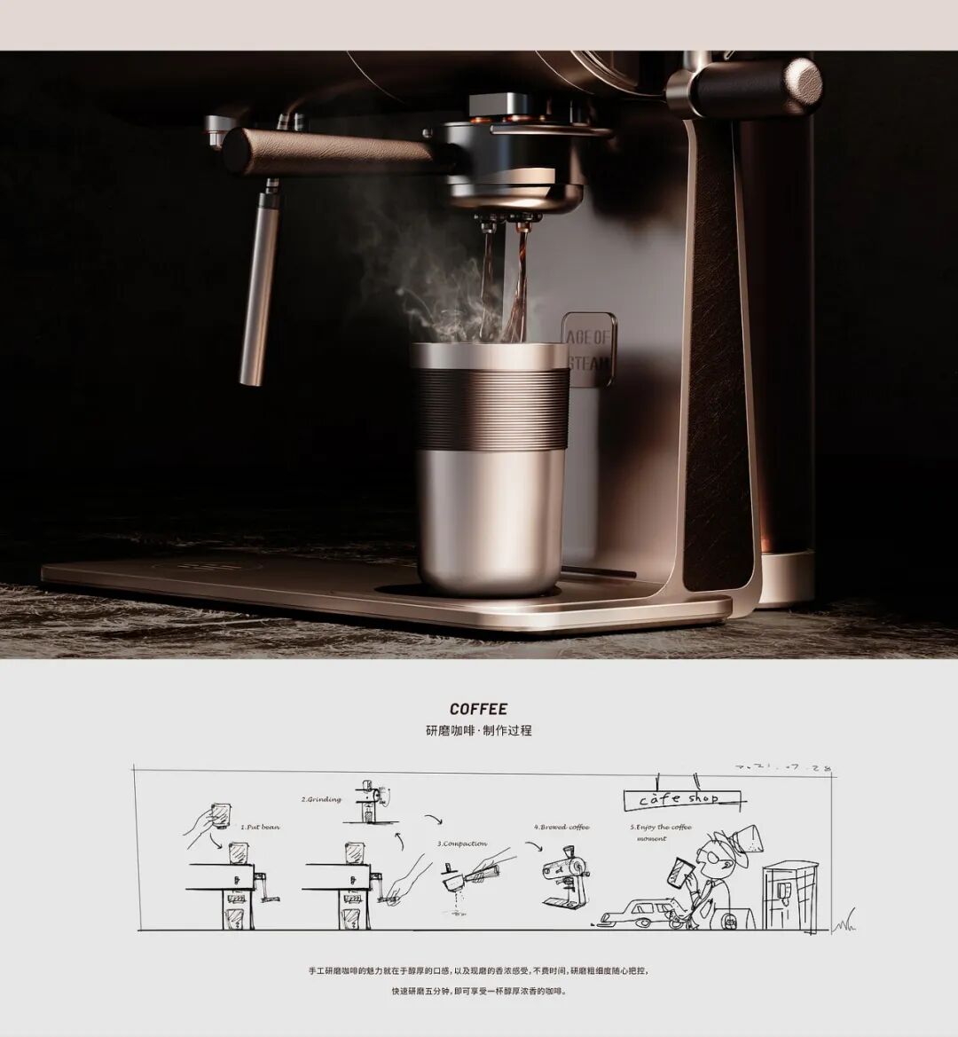 STEAM AGE是一款意式浓缩咖啡机,主要针对欧洲市场所设计;提取了旧式蒸汽火车头为设计元素,为该品牌定义独有的设计符号和设计风格,利于该品牌产品线的迭代,提高品牌辨识度,整体机身为金属材质,通过搭配不同的材质提升产品质感。