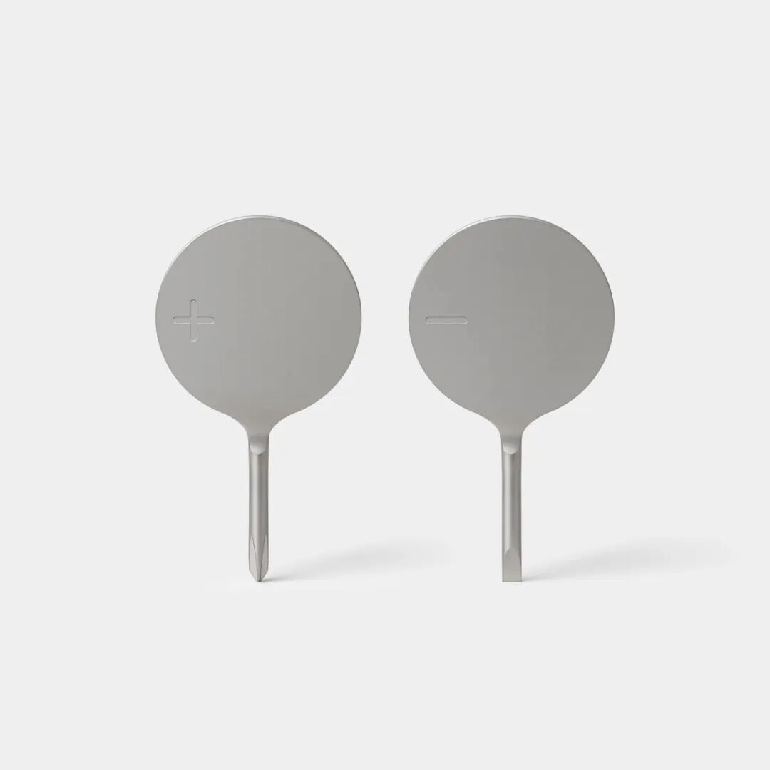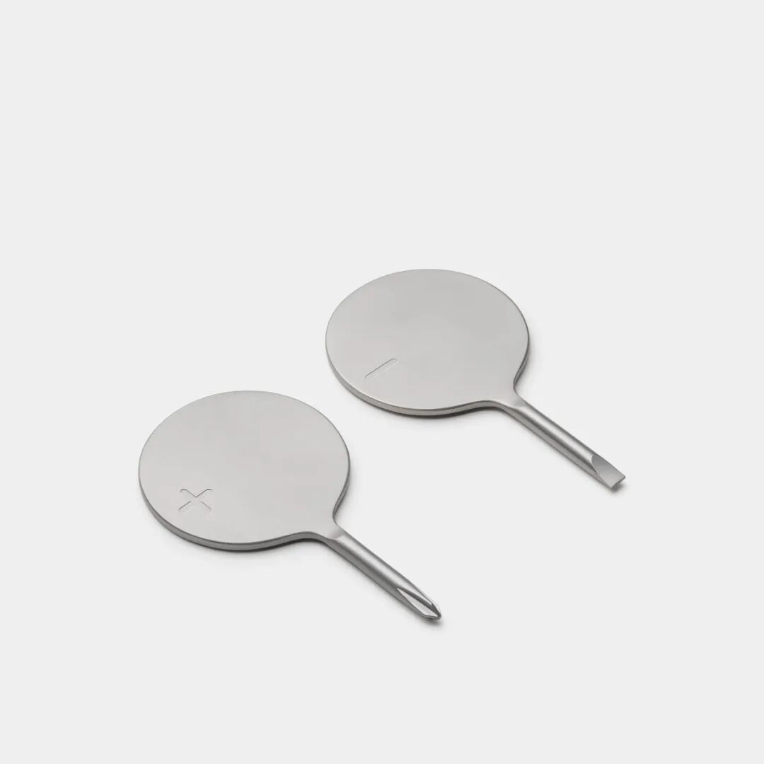 PlusMinus 采用抛光不锈钢制成,其精心设计的外形完美贴合手部,同时也让它像一件造型完美的艺术品一样放在您的办公桌上。套装包括 Phillips #2 和 3/16” 一字螺丝刀。加号和减号是为了方便人们区分两款螺丝刀哪个是用来拧螺丝的,哪个是用来卸螺丝的。