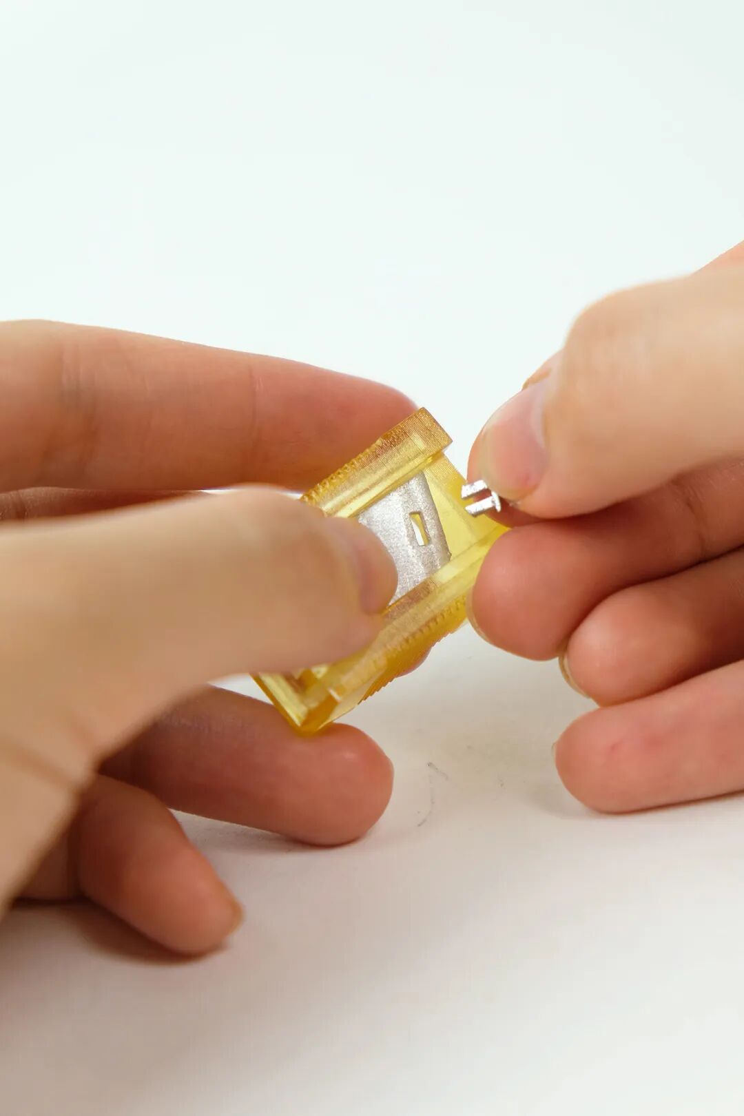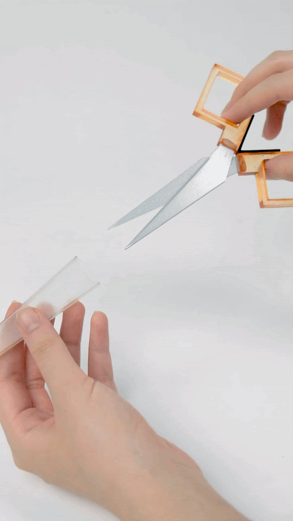 剪刀:设计师采用了重新设计的枢轴机构的普通剪刀原型。为了更换围绕圆形枢轴旋转的刀片,在剪刀轴处设立了 V形机制。