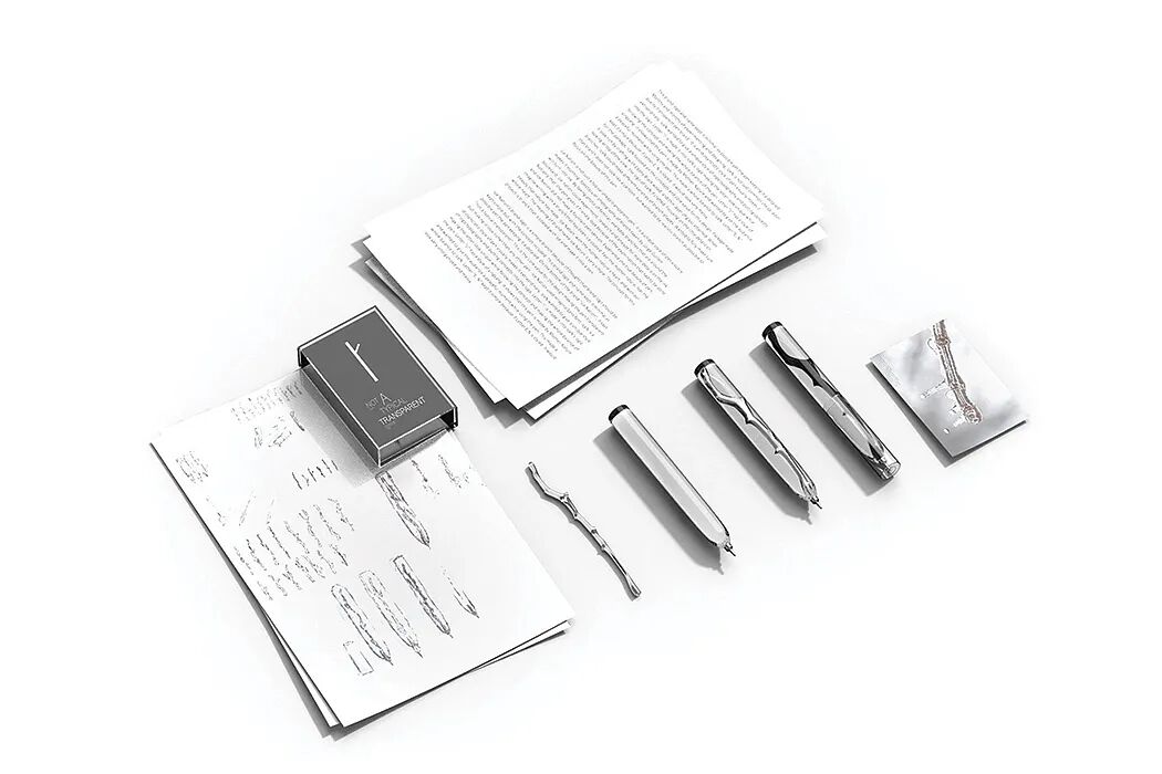 IceN通过研究被冰冻过的树枝,将它们制作成注入墨水的可替换3D打印笔芯。这支笔代表了环境意识与可重复使用性的结合。Geonwoo Kim意识到文字与自然之美间的联系,用IceN巧妙地向大地母亲致意颂歌,将设计与自然融合。