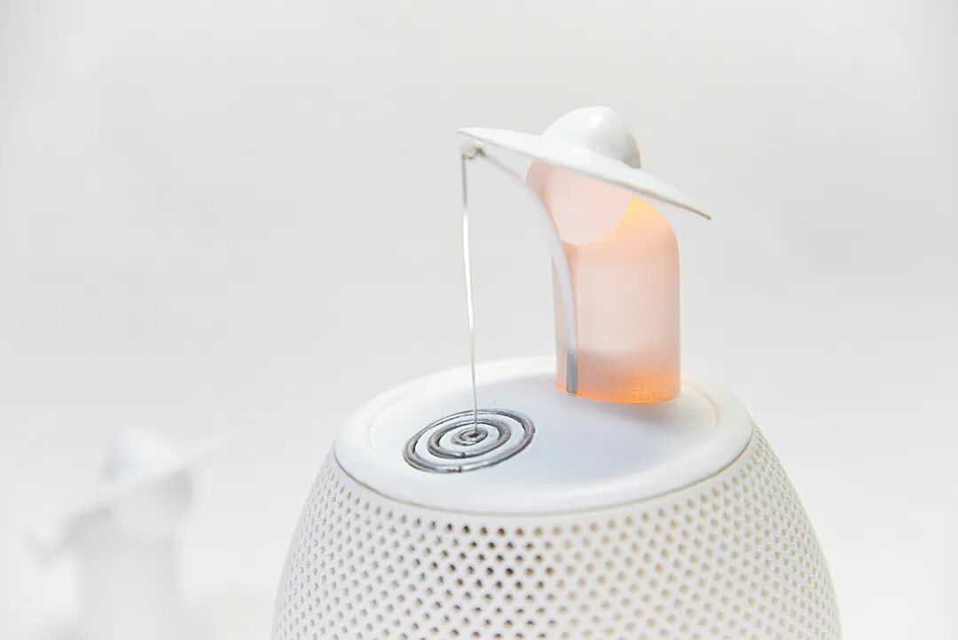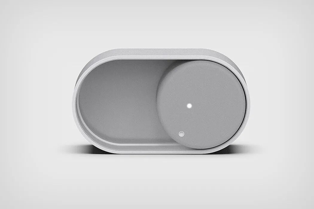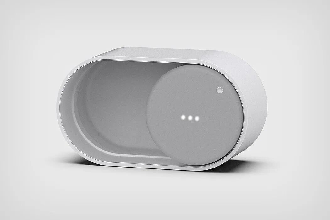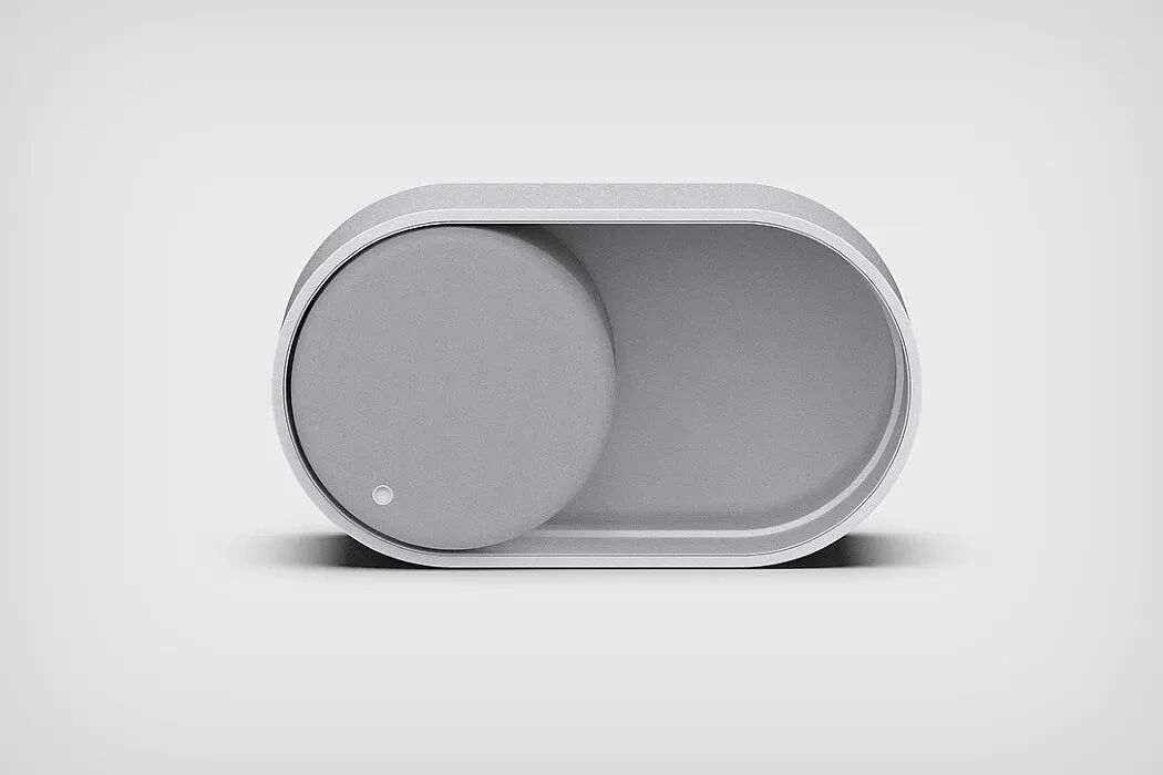 ONOFF的交互非常简单直观,足以在看到它的那一刻抓住任何人的眼球。圆形扬声器位于胶囊形外壳内,可以左右滑动。当音箱挪在左侧即为关闭,右侧即为开启,就像虚拟拨动开关一样。其中的LED以Google Home Mini方式点亮,告诉用户正收听的音量。简单而精致。