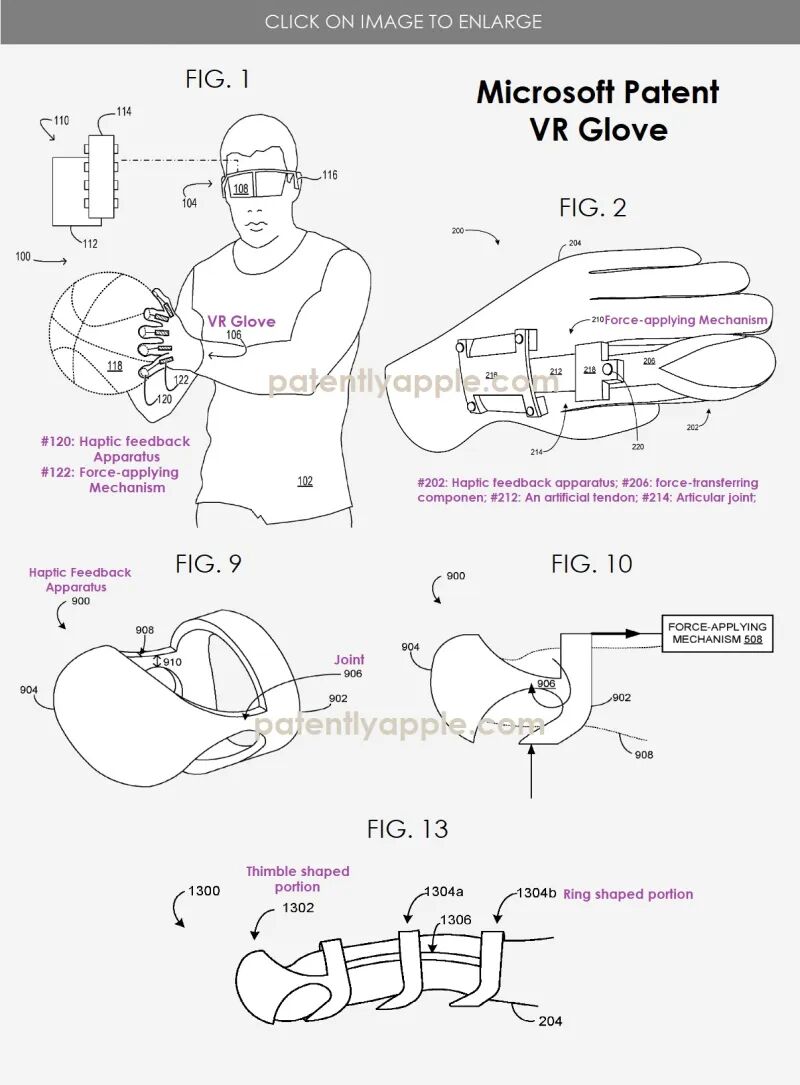 微软的专利图1显示了一个使用场景的例子,其中可穿戴物品利用触觉反馈装置来模拟与虚拟物体的触觉互动;图2示意性地显示了一个包括触觉反馈装置的可穿戴物品的例子;图9-11说明了触觉反馈装置元件的例子。
